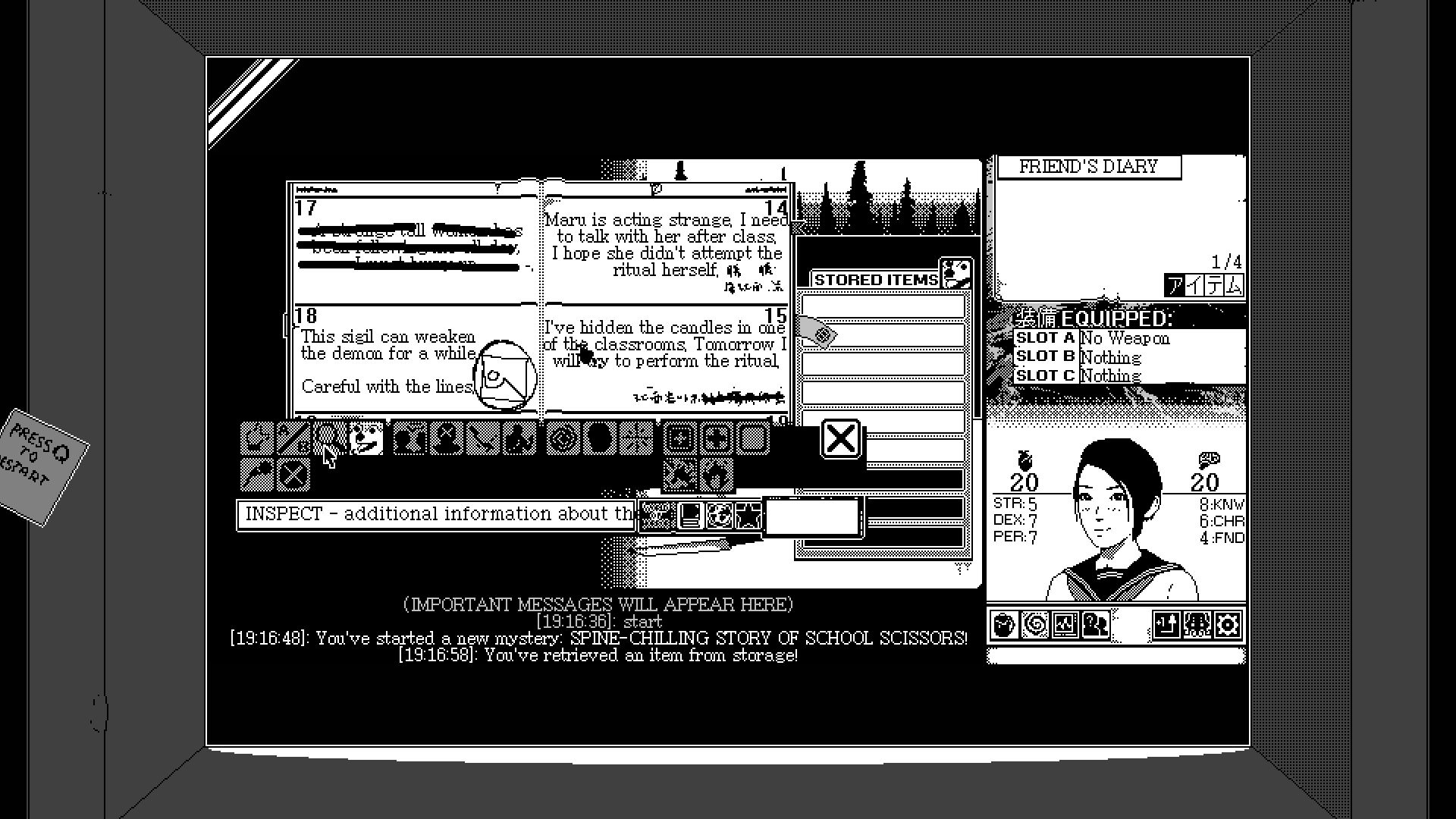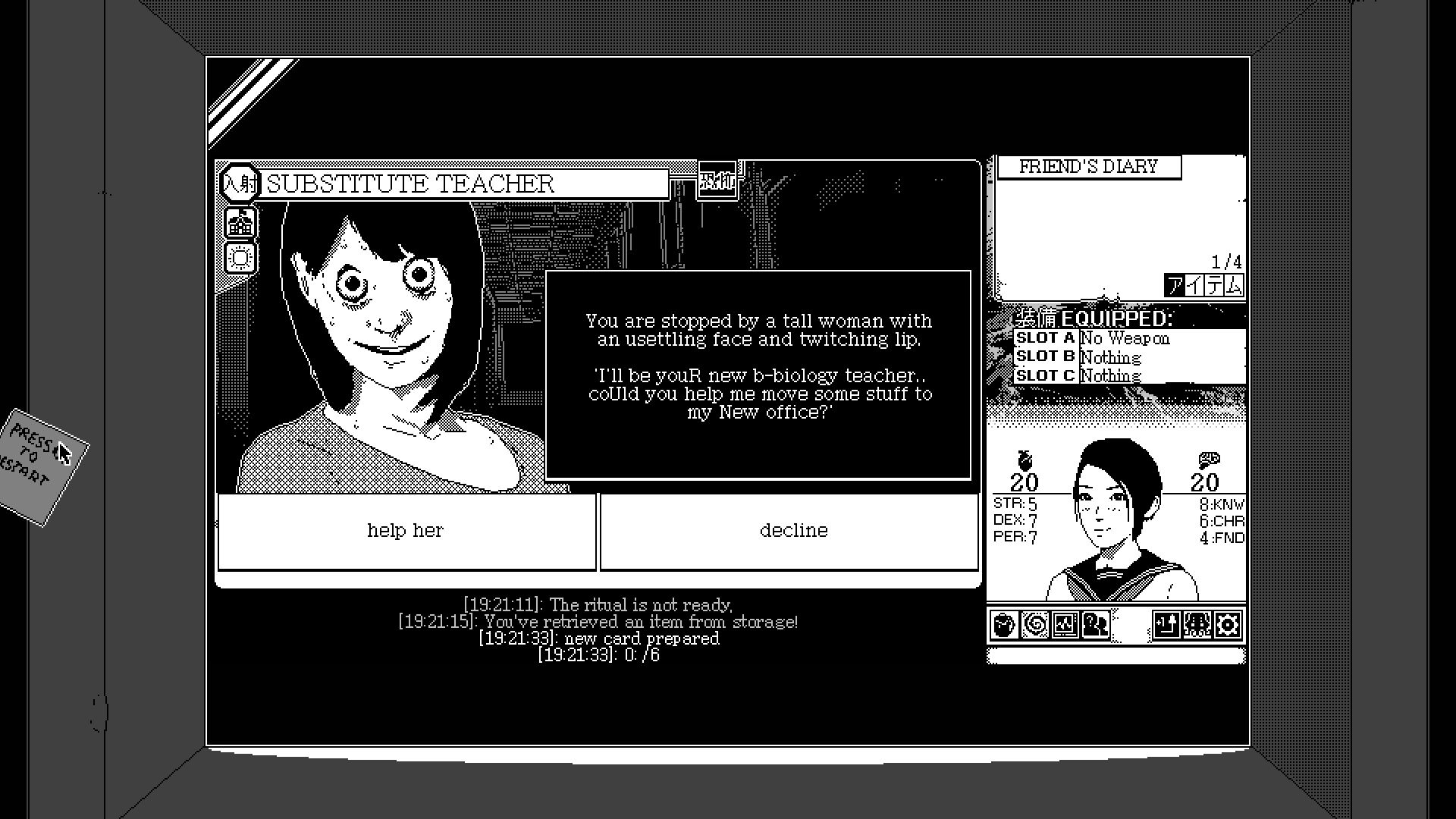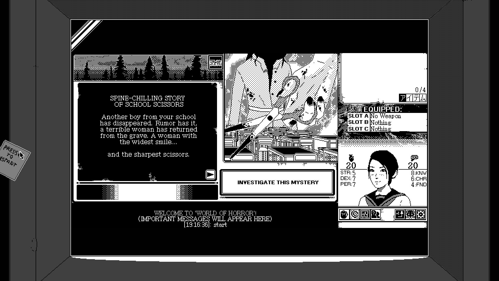 Back at PAX West 2018, we got to try out World Of Horror from Ysbyrd Games for about five minutes. The game was so intriguing, we had to go back at PAX East. If you're not familiar with this game, it takes on an old '80s PC kind of format where you make choices and those affect how you continue to play the game. The last time around we were brutally killed off by a ghost wielding a pair of scissors. This time around we figured out how to use the combat system to equip a bat and defend ourselves, which made things go by much smoother than before.