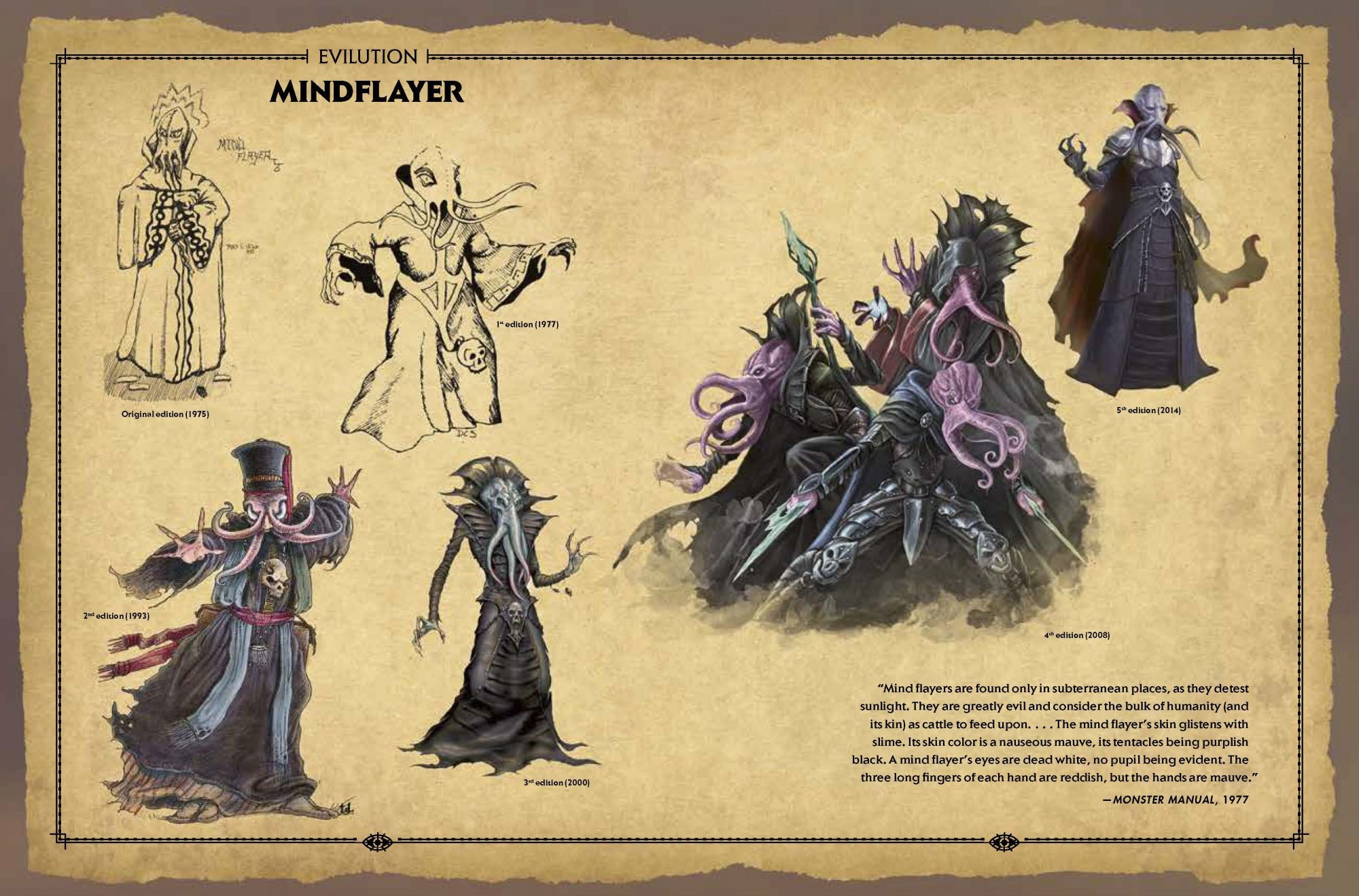 The book does an amazing job of showing off the evolution of monsters and how they've been depicted over the years, as you can see from the Mindflayer example below as it moves from the original 1974 illustration to the current version you see in 5th Edition. You get a great taste of how people who came into the series were inspired and tried to take the vision of what these creatures were in different directions.