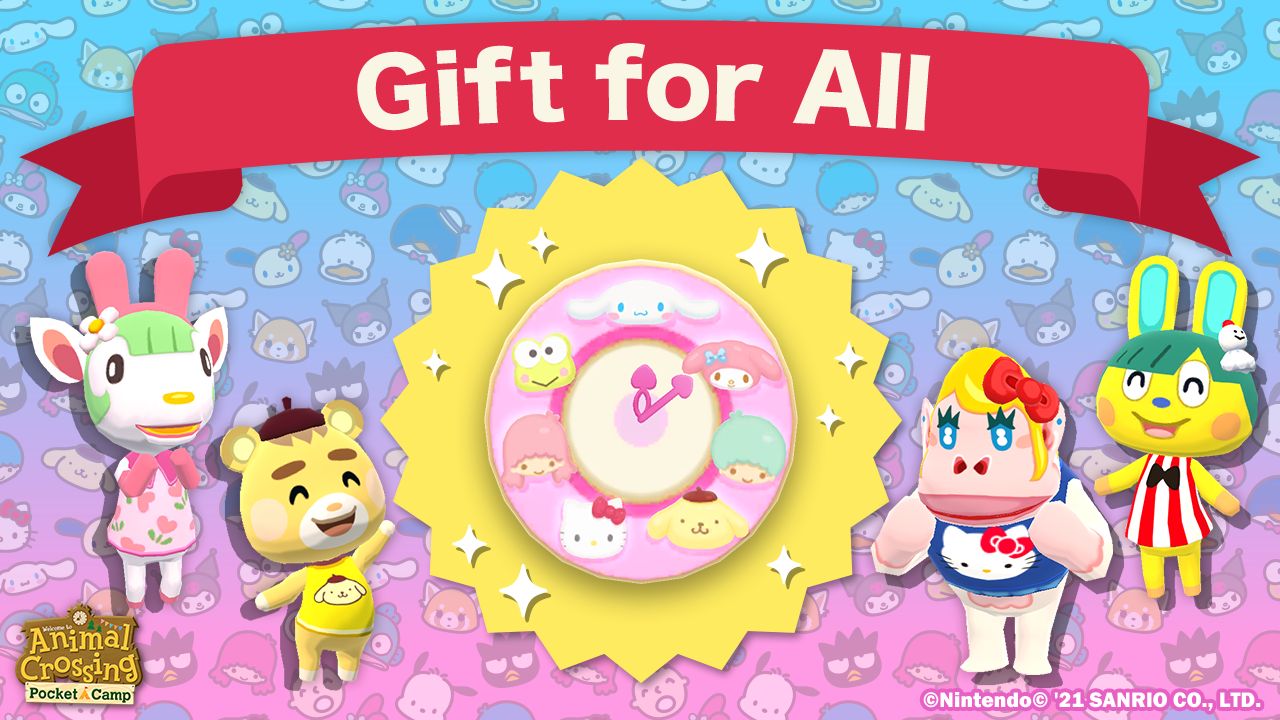 - All Animal Crossing: Pocket Camp players who log in during the event period can receive a free Sanrio Characters clock in-game item by tapping the gift icon.