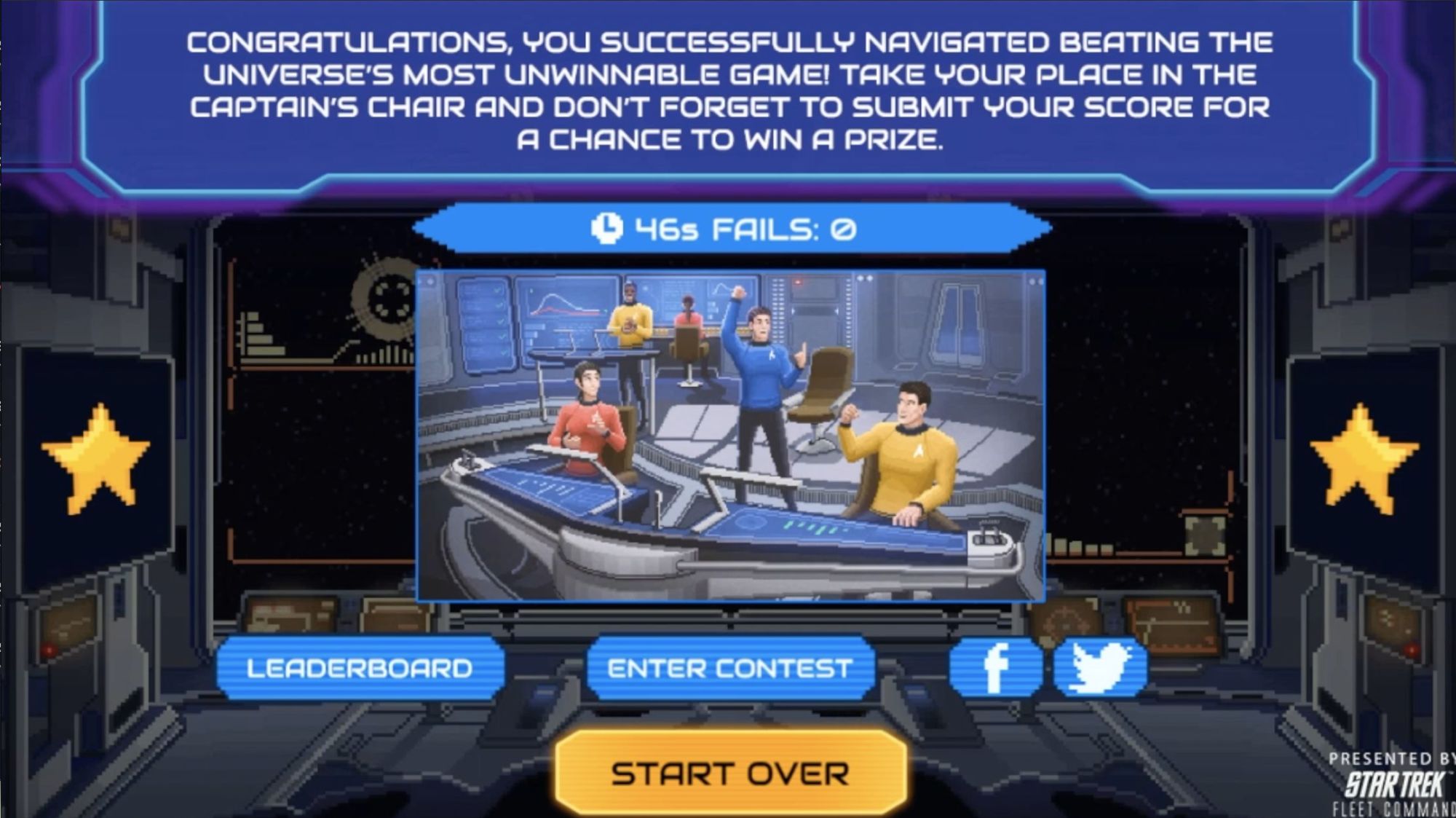 As part of this choice-based interactive experience, the player assumes the role of a Starfleet cadet facing the Kobayashi Maru for the first time. Only by choosing precisely the right path through endless perilous options will the player succeed where so many others have failed. With the odds of beating the Kobayashi Maru at around 1:10,000, the three fastest players to find the hack and defeat the simulation will win big prizes — including a CBS All-Access Lifetime Subscription and limited-edition Star Trek collectables. Adding to the nostalgia of Star Trek and to make failure fun, the game pays homage to the 1980s with incredible retro-inspired artwork and animation.