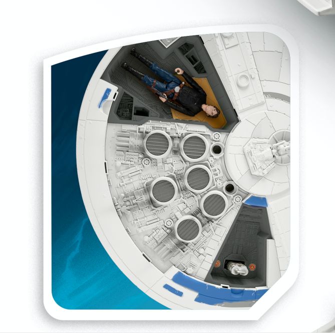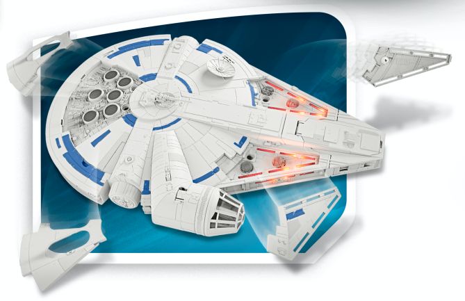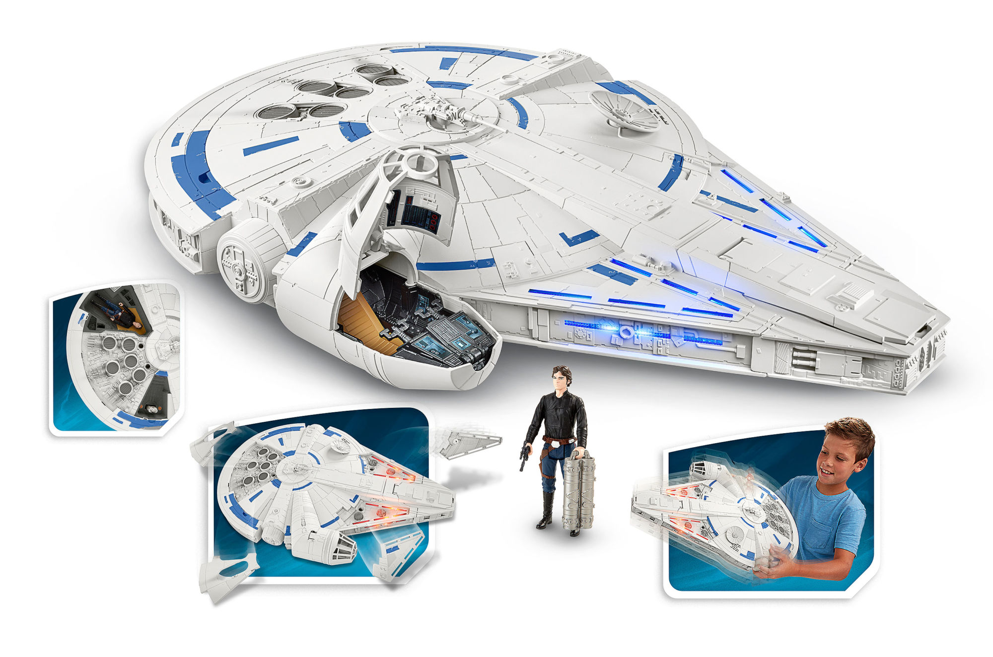 The Kessel Run Millennium Falcon will have light-up features, Force Link capabilities, hyperspace sounds, break-away panels, and comes with a 3.75 inch Han Solo figure different from the regular release. It also looks like the front part of the Falcon looks to detach. This one will run you a pretty reasonable $99.