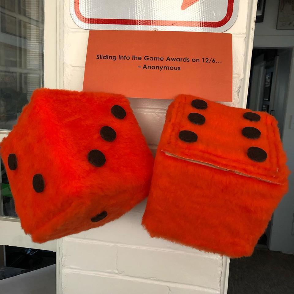 A number of us in gaming journalism got an interesting package in the mail today, hinting at another reveal at The Game Awards. If you look on Twitter today, you'll see several writers received this pair of orange fuzzy dice, as I did this morning. There's nothing special or remarkable about them other than one of the dice is missing all of the numbers except for the 6-side, and they came with this simple note about The Game Awards.