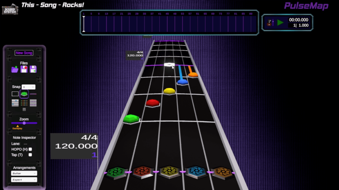In addition to gameplay, Sound System revives the classic 5-fret guitar rhythm experience while innovating with a revolutionary PulseMap Editor—described as "Mario Maker meets Guitar Hero." This in-game note chart editor allows players to upload their own music, create charts from scratch, or edit existing ones. Artists can upload original music and see it come to life in the game. Players can share charts with friends, unlocking massive community creativity.