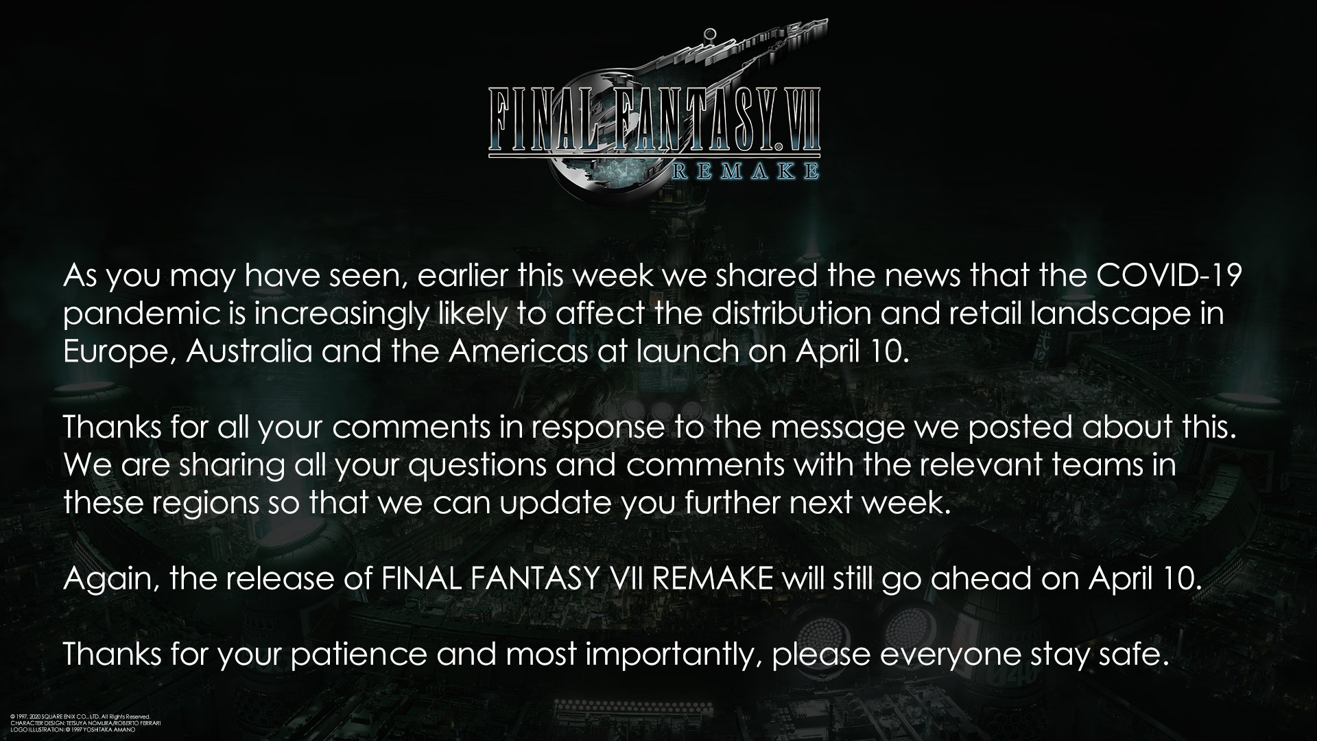 It looks like the digital version of Final Fantasy VII Remake will be released as planned. However, that leaves what's going on with the physical editions up in the air. Especially since that statement isn't too clear about what people can expect when April 10th rolls around. Since the company can't seem to guarantee physical versions will be in stock, best safe to assume it won't be happening for most people who purchased it right away. In fact, we're willing to be the company will end up offering those who pre-ordered a physical copy an offer to get a digital version in the meantime. But we're still three weeks out from the release, and anything can happen between now and then.