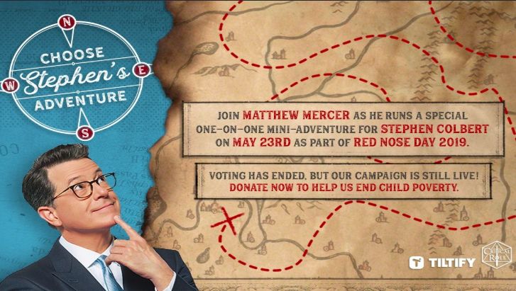 Red Nose Day is coming up this week on May 23rd, and for D&D fans you're going to get a special game featuring Stephen Colbert and Critical Role. To be more specific, Matthew Mercer will be guiding Colbert through a mini one-on-one adventure in which people made donations to Red Nose Day and choose what Stephen has to work with. Everything from his character class, his companion, his legendary weapon to be sought, to the big bad villain he has to deal with.