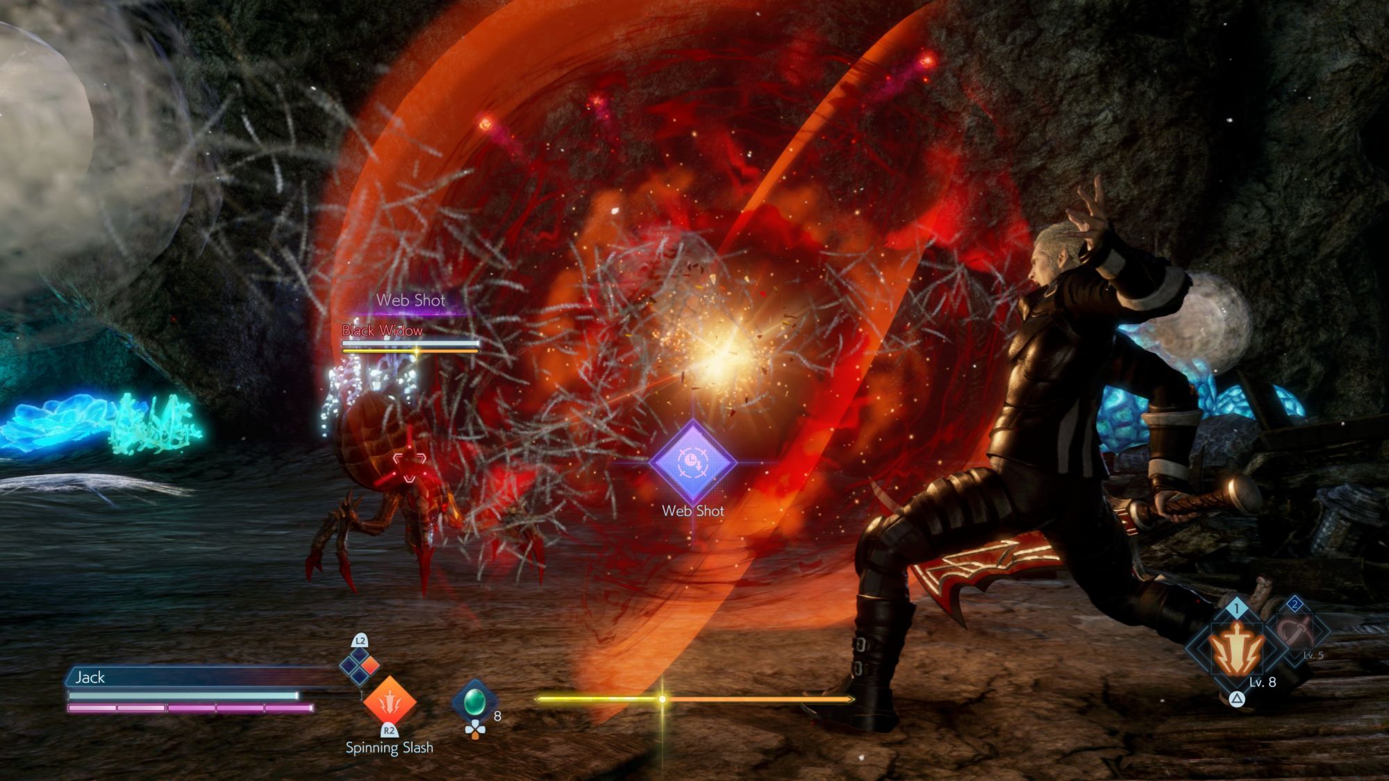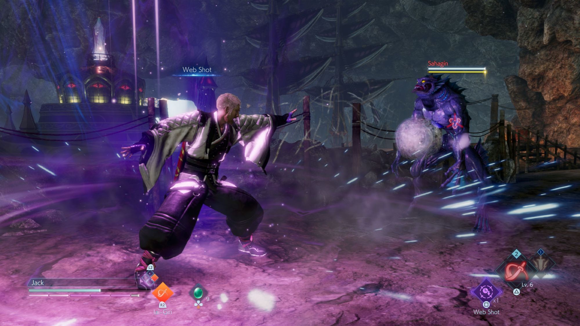 This next set of screenshots focus on combat and one of its key features – the break gauge. This appears as a yellow bar above enemies and wearing it down should be a priority in combat. Combos and abilities will reduce the enemy's break gauge, shown as a yellow bar above an enemy. Once the gauge is depleted, you can unleash a powerful Soul Burst to crystallize them and take them out in a single blow! It's not just enemies that have a break gauge – Jack does too, shown above in the bottom-center of the screen.