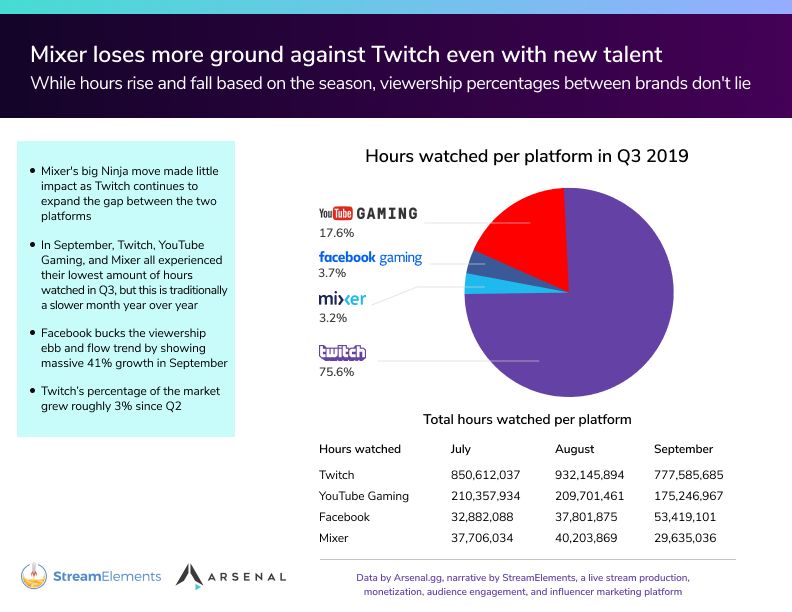 According to the data in the infographic, which appears courtesy of Arsenal.gg, you can see the company only gained a small percentage of hours watched on the platform after Ninja's move, but Twitch still dominated the viewing audience as a whole. What's more, Mixer fell behind Facebook Gaming as far as viewership, making the Microsoft-owned platform the lowest of the four. Here's a quote from Doron Nir, CEO of StreamElements on the release of the info.