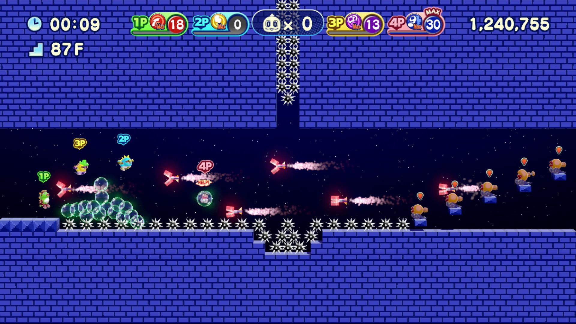 A newly included feature for Switch will be the much requested online ranking. This will allow players worldwide to compare their high scores and compete against each other, giving the game an additional boost on replayability and fun. Bubble Bobble 4 Friends received a lot of praise from the critics and fans, with many requesting more content. Taito and ININ Games listened. The Baron is Back comes with 100 unique, new stages: twice as many stages as before! The return of the fan-favourite villain, Baron von Blubba, brings additional thrills and makes the new stages quite challenging, given that he is invincible. The player has to dodge him while defeating the other enemies one by one to clear the stage.