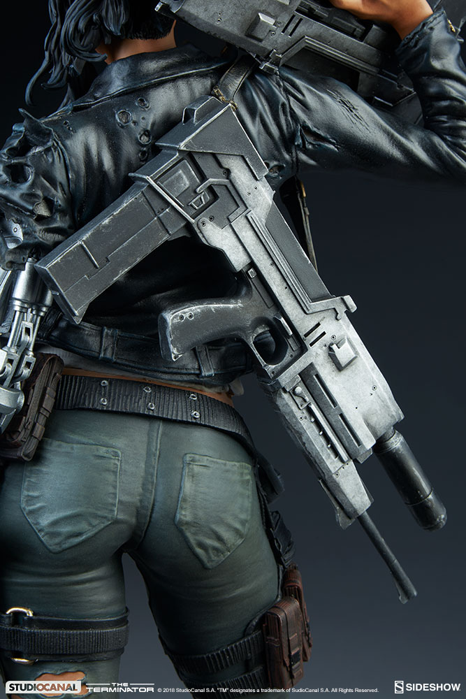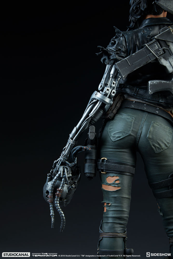 The resin Mythos Premium Format™ Figure features an incredibly detailed sculpted costume, consisting of a black jacket, white undershirt, green pants, and combat boots. Her rugged look is textured with tatters and tears to reflect the raging battle against the oppressive forces of Skynet.