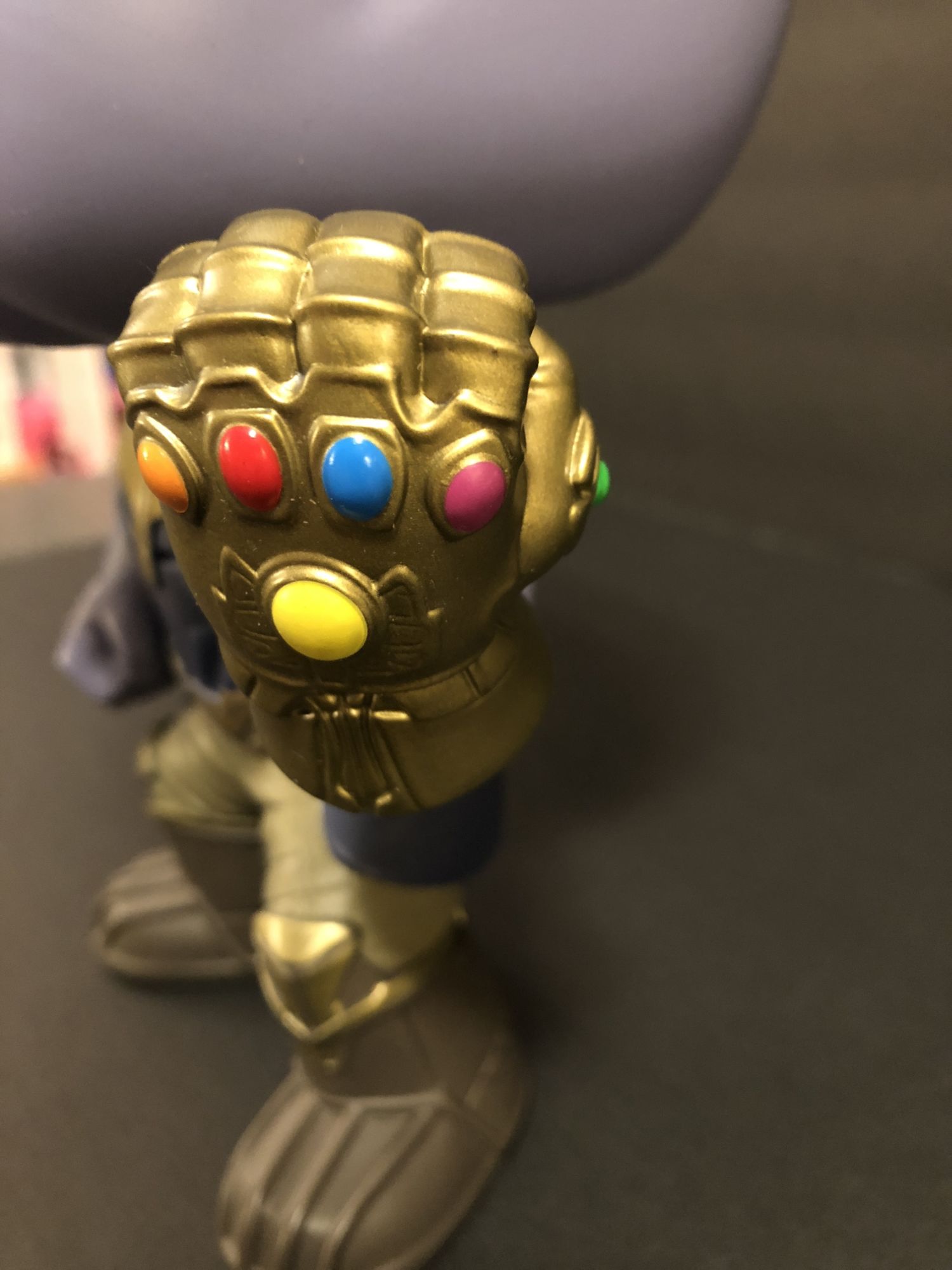 Thanos comes in an awesome oversized Pop box, with a giant picture window showing off the Pop. After the problems with Hulk's hammer breaking in shipment, they took extra precautions protecting the Infinity Gauntlet and wrapped it in plastic inside. Mint in box collectors take note- the bottom of the Pop speech bubble on the top of the border near the top of the box bends up on a lot of these. Keep an eye on yours.