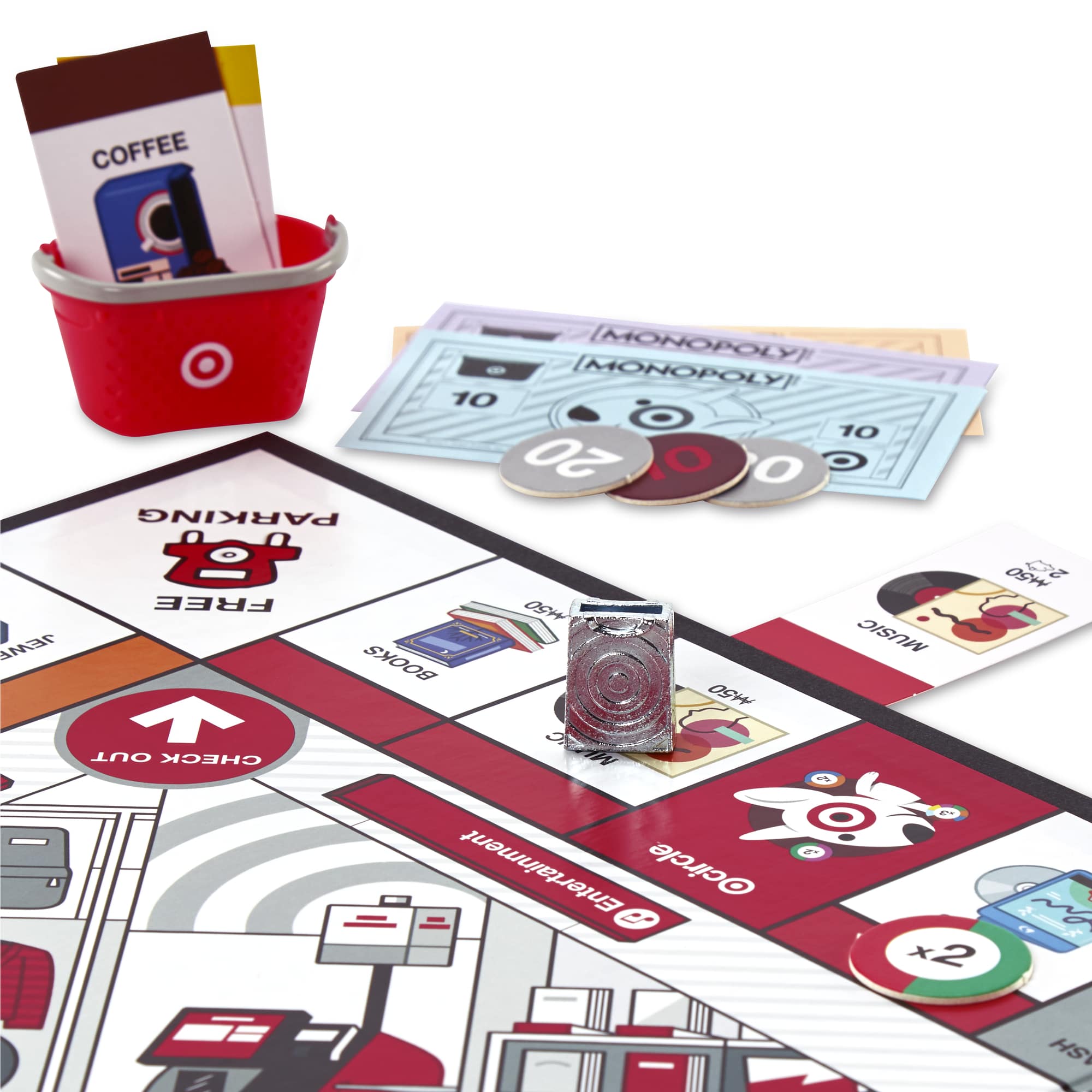 Just in case you're the kind of person who loves Monopoly and shopping at Target, Hasbro has created a version of the game for you. As you might suspect from the look of the box cover below, Monopoly: Target Edition is a version of the game based entirely within a Target store, co-developed by both companies as a way to "encapsulate the unique and joyful shopping experience". This version of the game is basically the same one you've always played, only this time players will browse through different sections of the store while moving around the board collecting as many items and Target Circle tokens as they can. As you can see from the images below, even some of the tokens are themed to the game as you have a shopping cart, a coffee mug, and even the mascot Bullseye (who also sits on the cover).