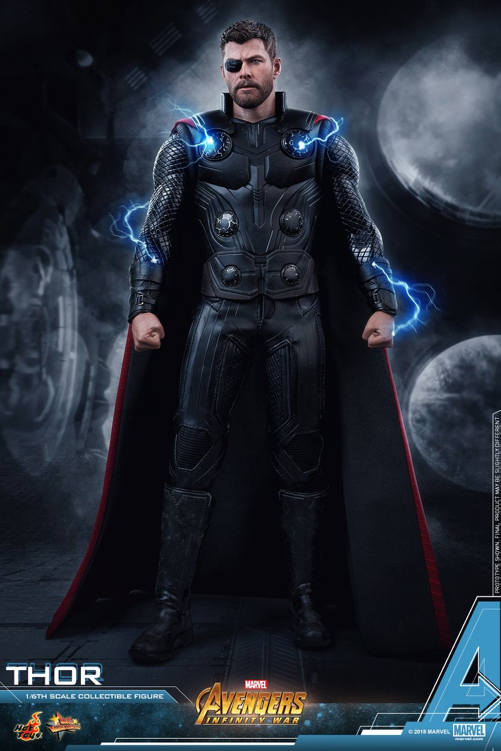 Thor is now the second revealed Hot Toys figure from Infinity War. Thor will come with Stormbreaker, LED lights inside his costume, an all new body mold, new headsculpt that looks incredible, his eye patch (!), and a removable cape. Seriously — that face portrait is astounding. hands down the best-looking Chris Hemsworth scan they have done.