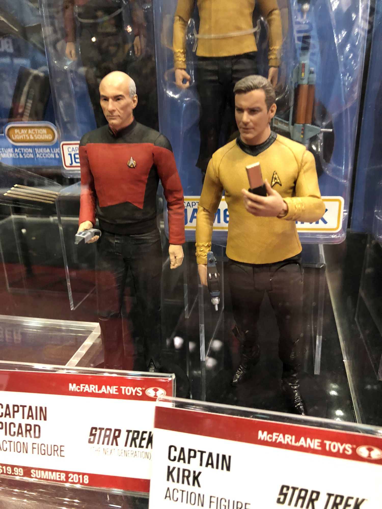 The other line I was curious about was their Star Trek offerings. I was happy to see three eras of Trek represented- Original Series, Next Generation, and the new show Discovery. The figures are interesting, as they are some of the first to come on blister cards instead of a box for awhile. They are transitioning away from the box I was told, and the cards for the Trek line look sleek and sharp. I really like the Picard figure, and I love that his Make It So hand is posed perfectly in the package. I am looking forward to getting these.