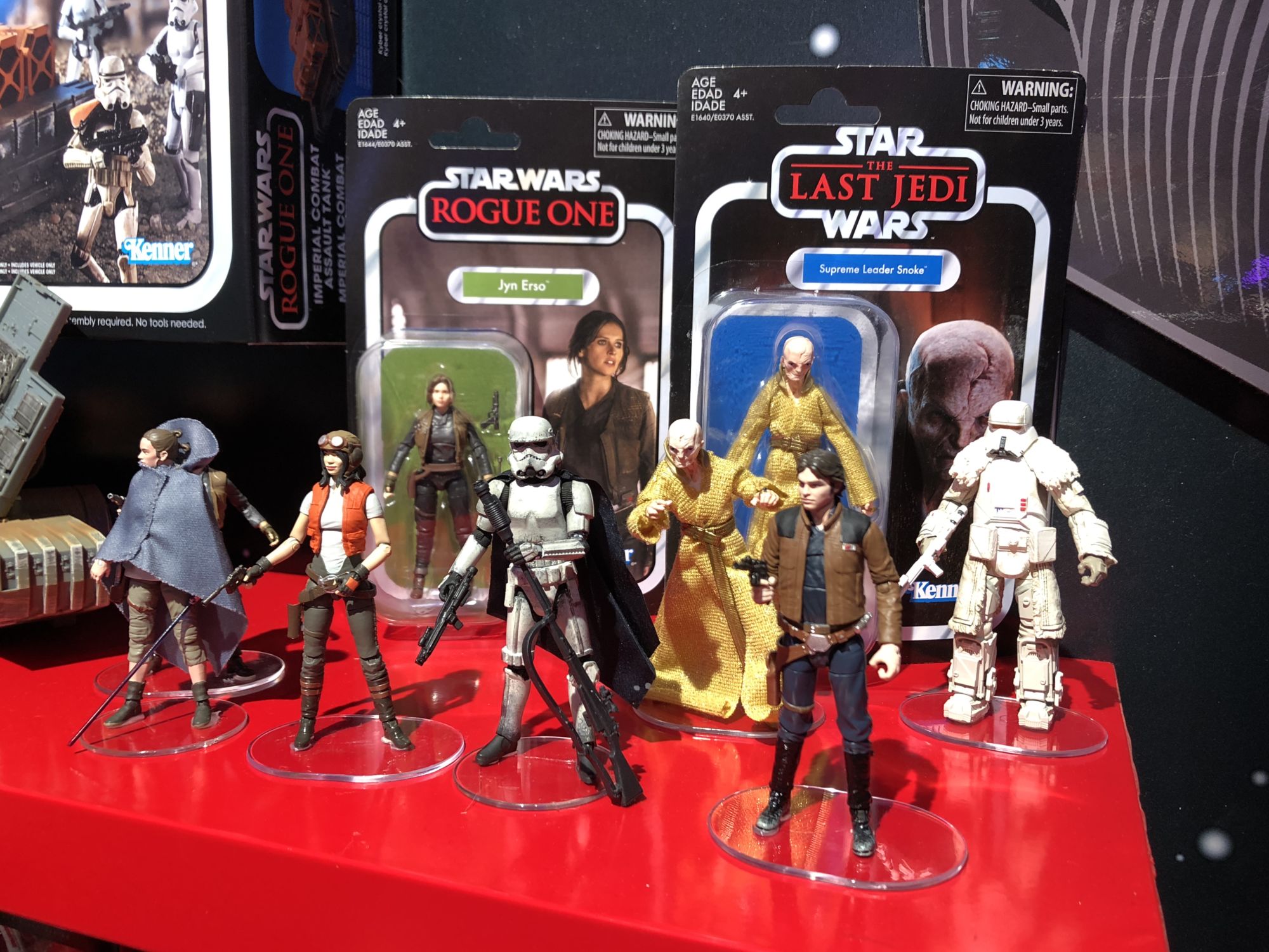 What everyone in the room really cared about, though, is the return of The Vintage Collection. Looks like this year we will not be getting a TON of these, but they did reveal a few newbies like Cassian Andor, Luke Skywalker from The Force Awakens, and the trooper from Solo. Han Solo himself makes an appearance on a Vintage Card, as well. We will also be getting vehicles in vintage packaging, with the Imperial Assault Tank making an appearance. The first figure of Doctor Aphra from the comics will also be on a vintage cardback. The numbering will continue from the end of the first line, and that WILL include exclusives. One such exclusive shown on a slide was a Rey on Ach-To training figure, exclusive to Walmart.