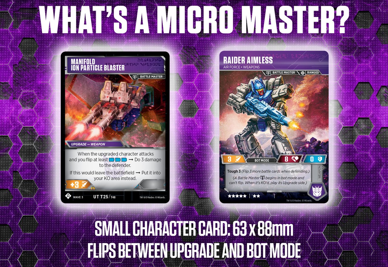 Those cards will be 63 X 88mm and will feature a flip that can be an upgrade or a Bot. Thats should make for some fun deck building. Each booster pack will come with one regular Bot card, one Battle Master or Micro Master card, and battle cards as well.