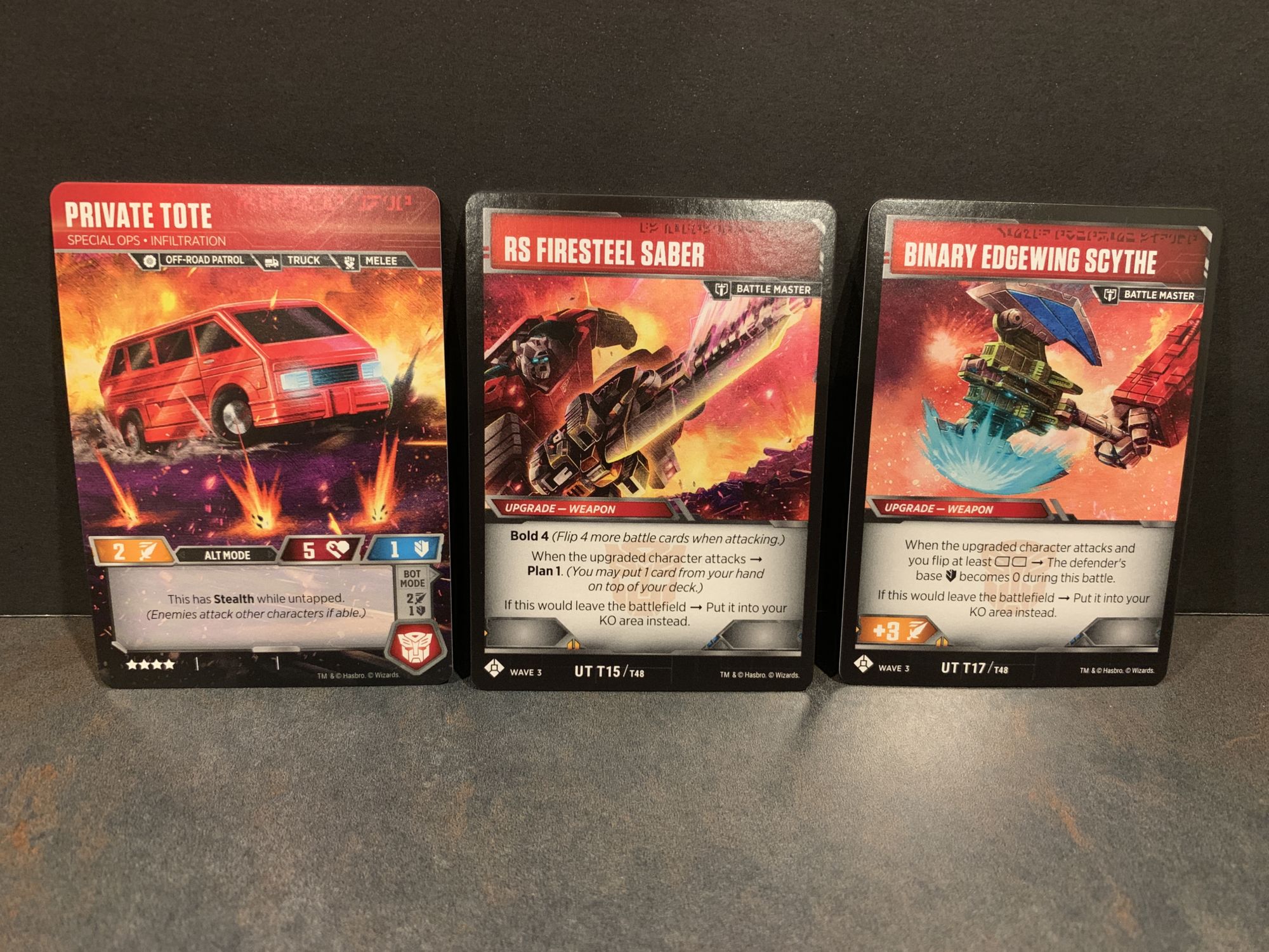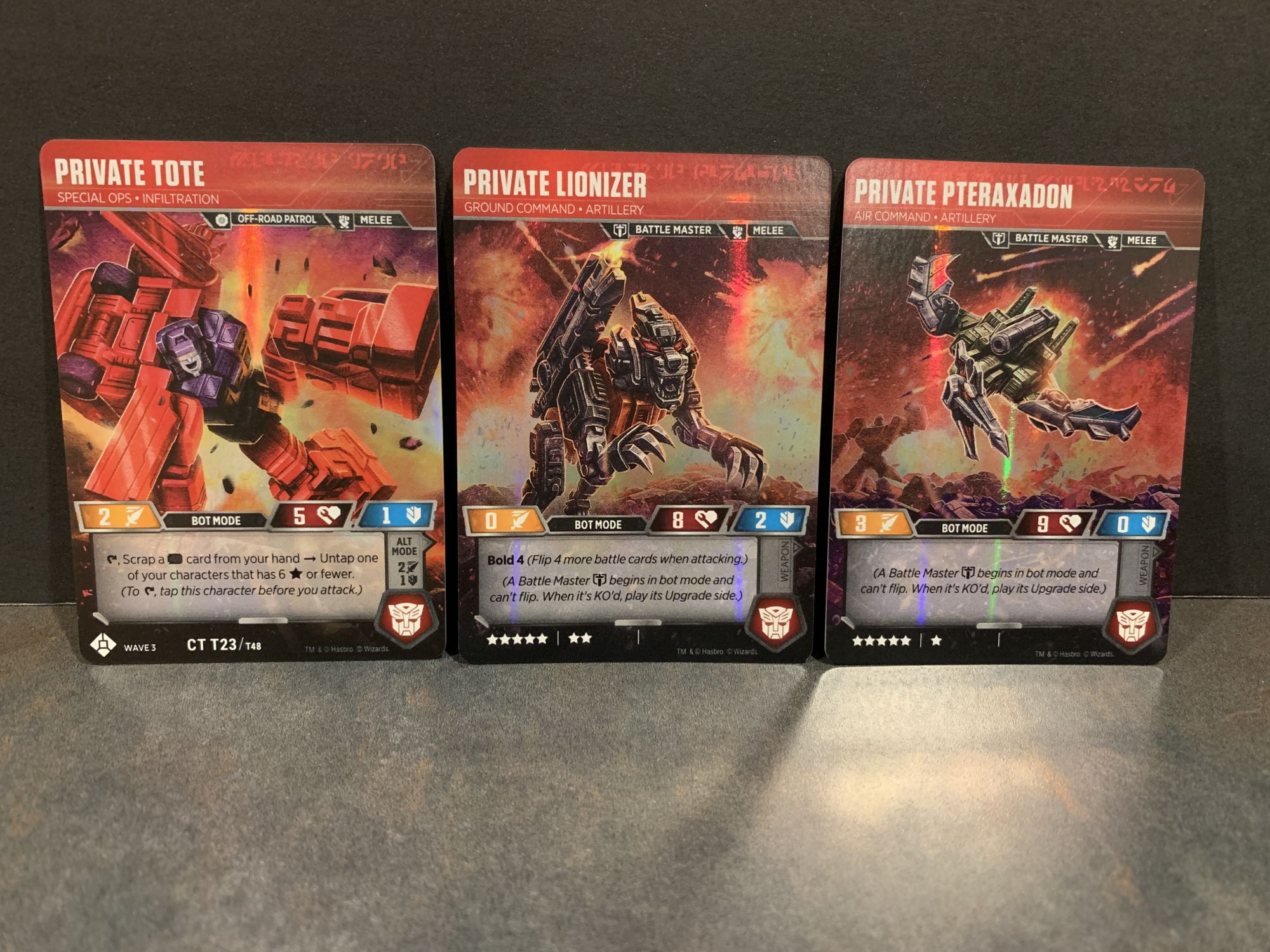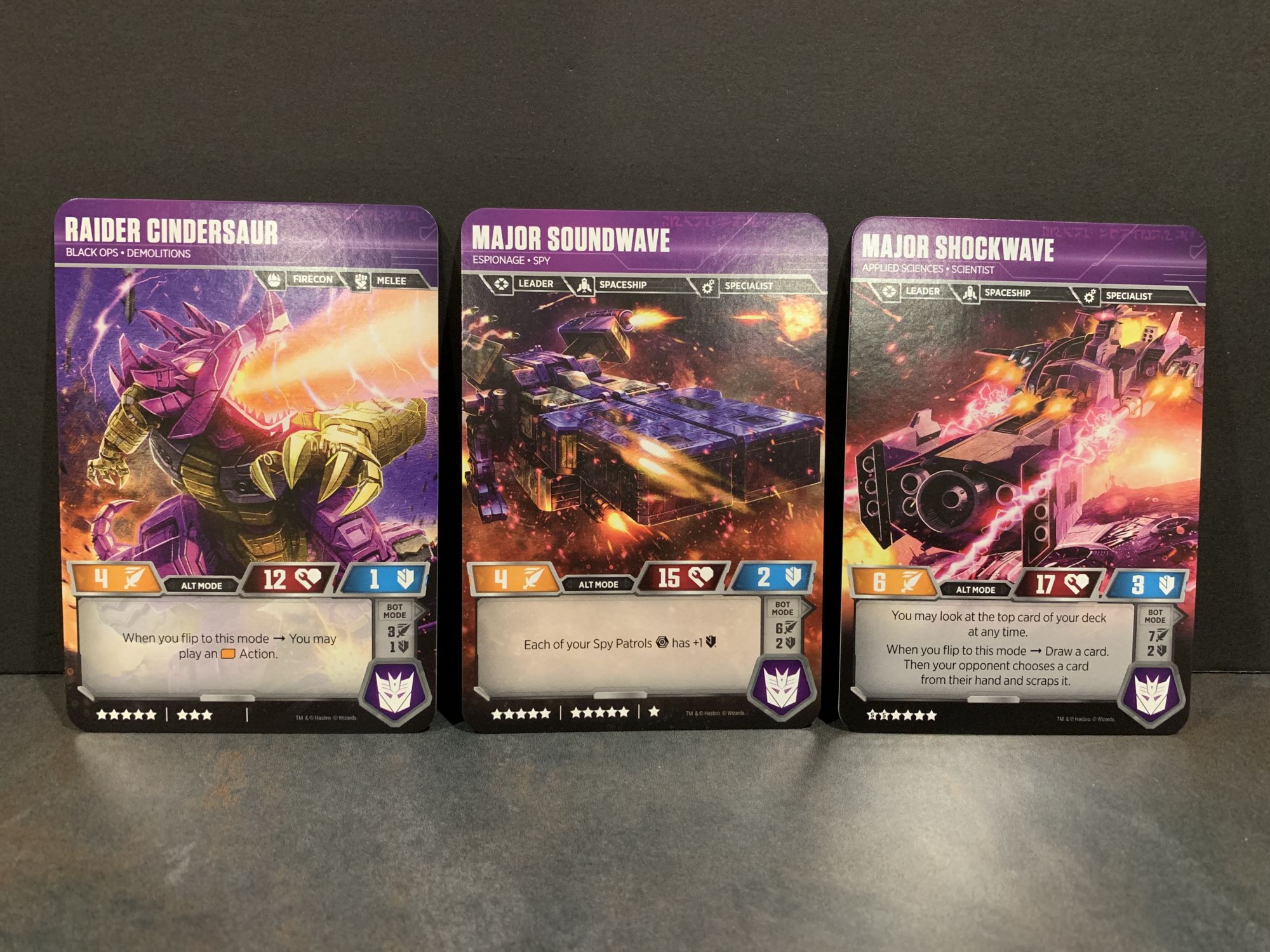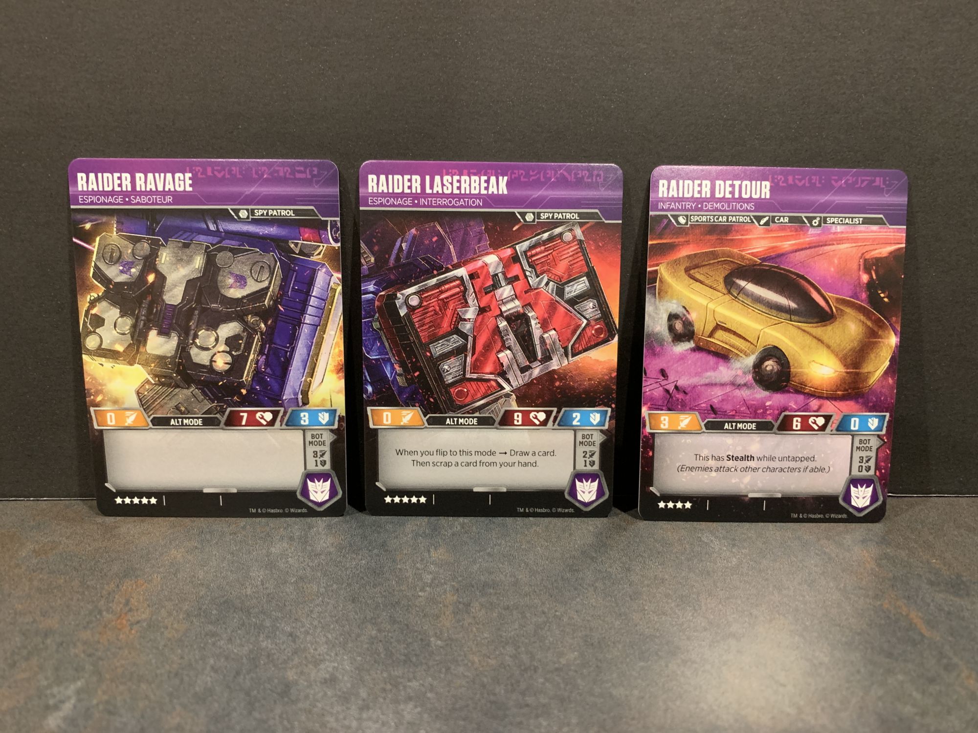 I also love the smaller Bot cards. Ravage and Laserbeak are must-haves since Soundwave is finally here. These are all instantly going in my Decepticon deck. I have love for the Autobot Transformers cards too, but since I lean on the purple side, I get more excited for them. I find that I play with more confidence when I am taking down Autobot scum.