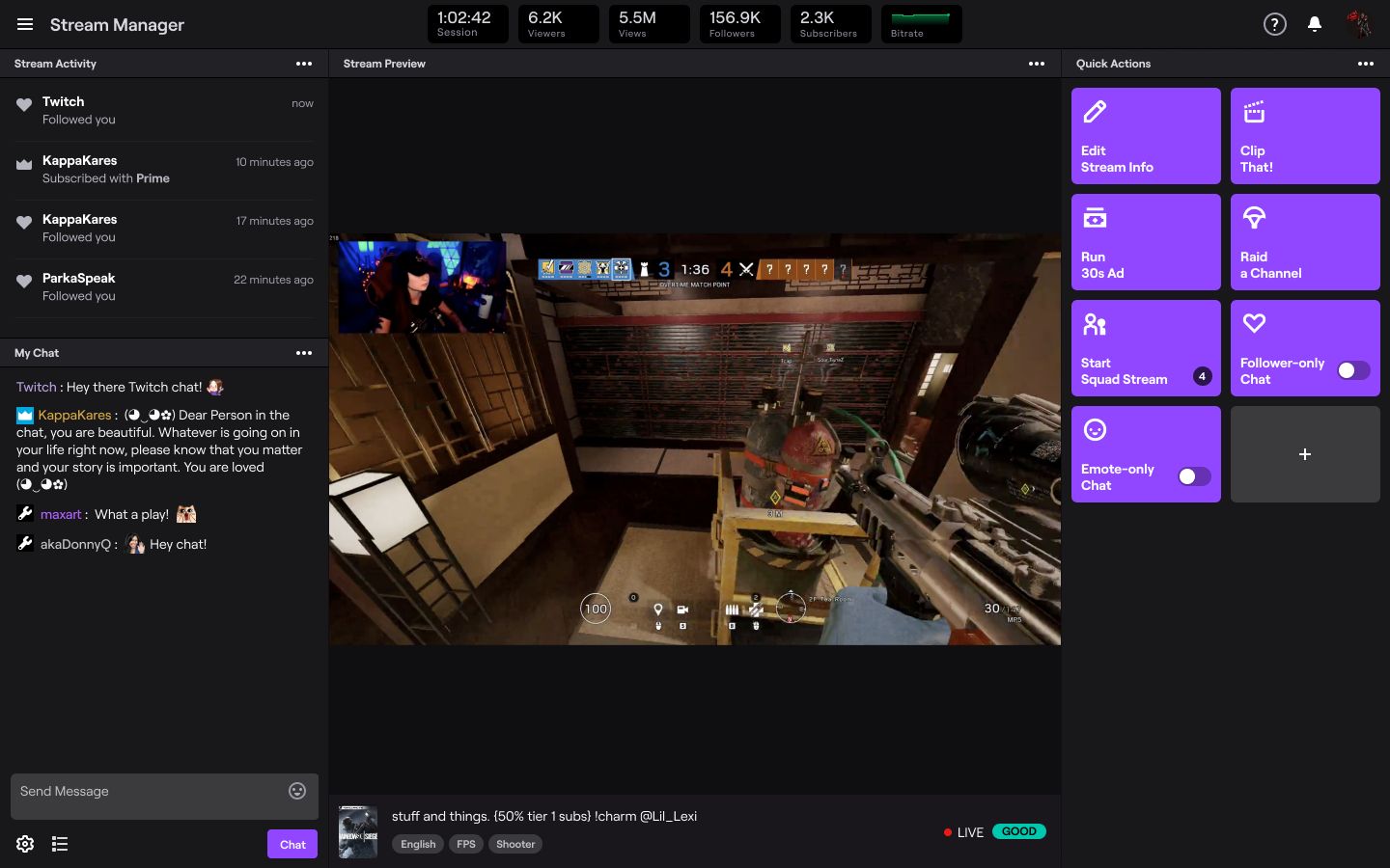 Quick Actions: Perform powerful actions with a single click, including clipping, running an ad, emote only chat, and more.