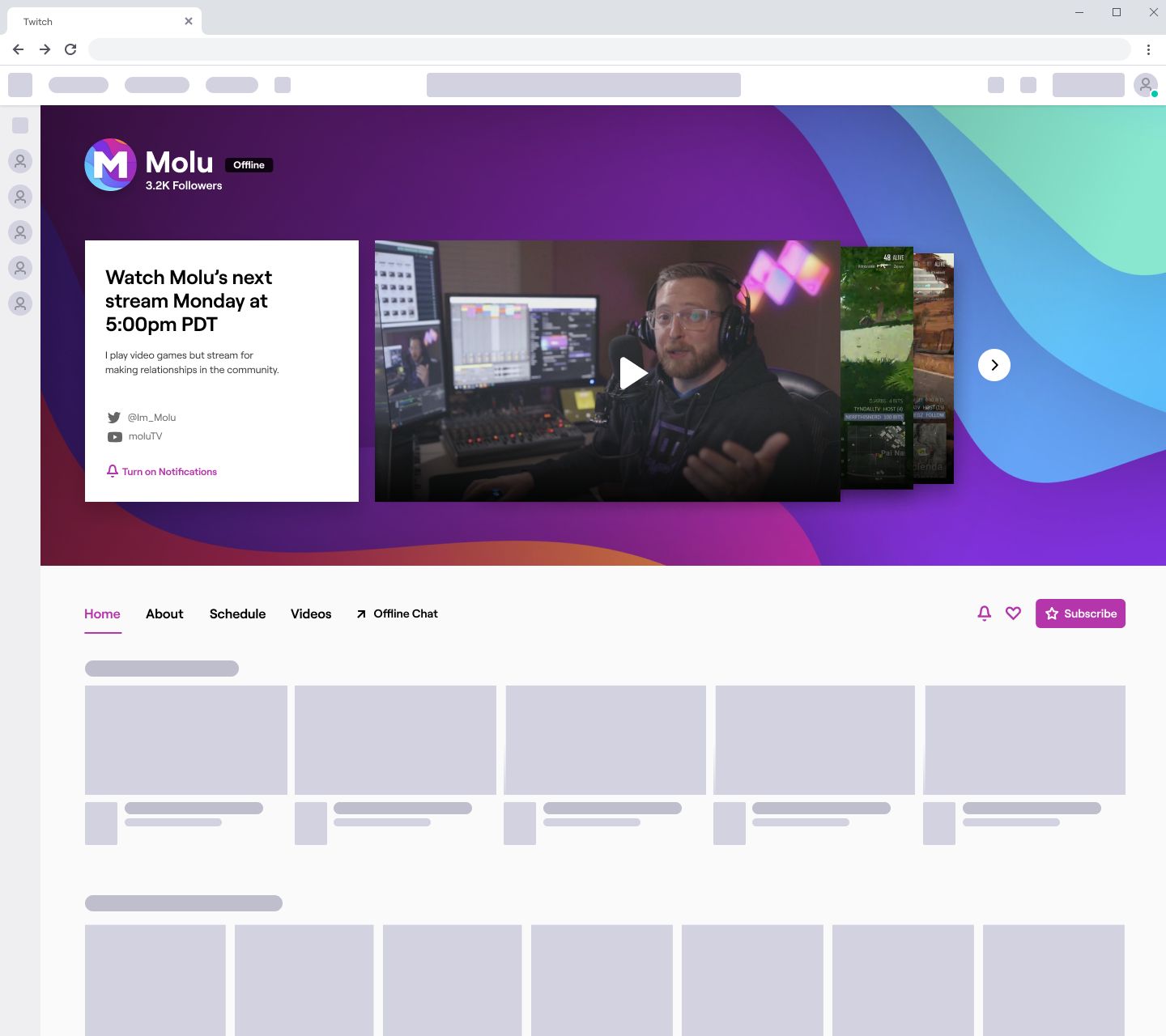 Channel Page: We're redesigning the channel page to enhance the viewer experience and give streamers more ways to express themselves. We shared an early preview at TwitchCon and this will begin rolling out later next year. The new channel page will include the ability to create a channel trailer, publish stream schedules, and provide more detail to help new viewers get to know you and your channel.