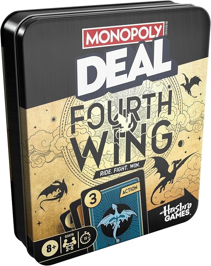 Ride, fight, win in the Monopoly Deal: Fourth Wing Edition game, inspired by the bestselling Empyrean series by Rebecca Yarros! Welcome to the Riders Quadrant, where you've bonded with a dragon and are on your way to becoming a protector of Navarre. Use your signet to gain a competitive advantage over other riders. Protect locations and dragons to prove yourself as a bright young military strategist. Use action cards to collect blades for a personal Armory, summon and swap properties, and more. The first rider to collect three different complete property sets wins! Looking for Fourth Wing gifts, 2-player games, or fun card games for adults, teens, and kids? This Monopoly Deal game is a worthy choice. Fourth Wing party games are also great portable travel games for road trips, bachelorette parties, and Threshing Day.