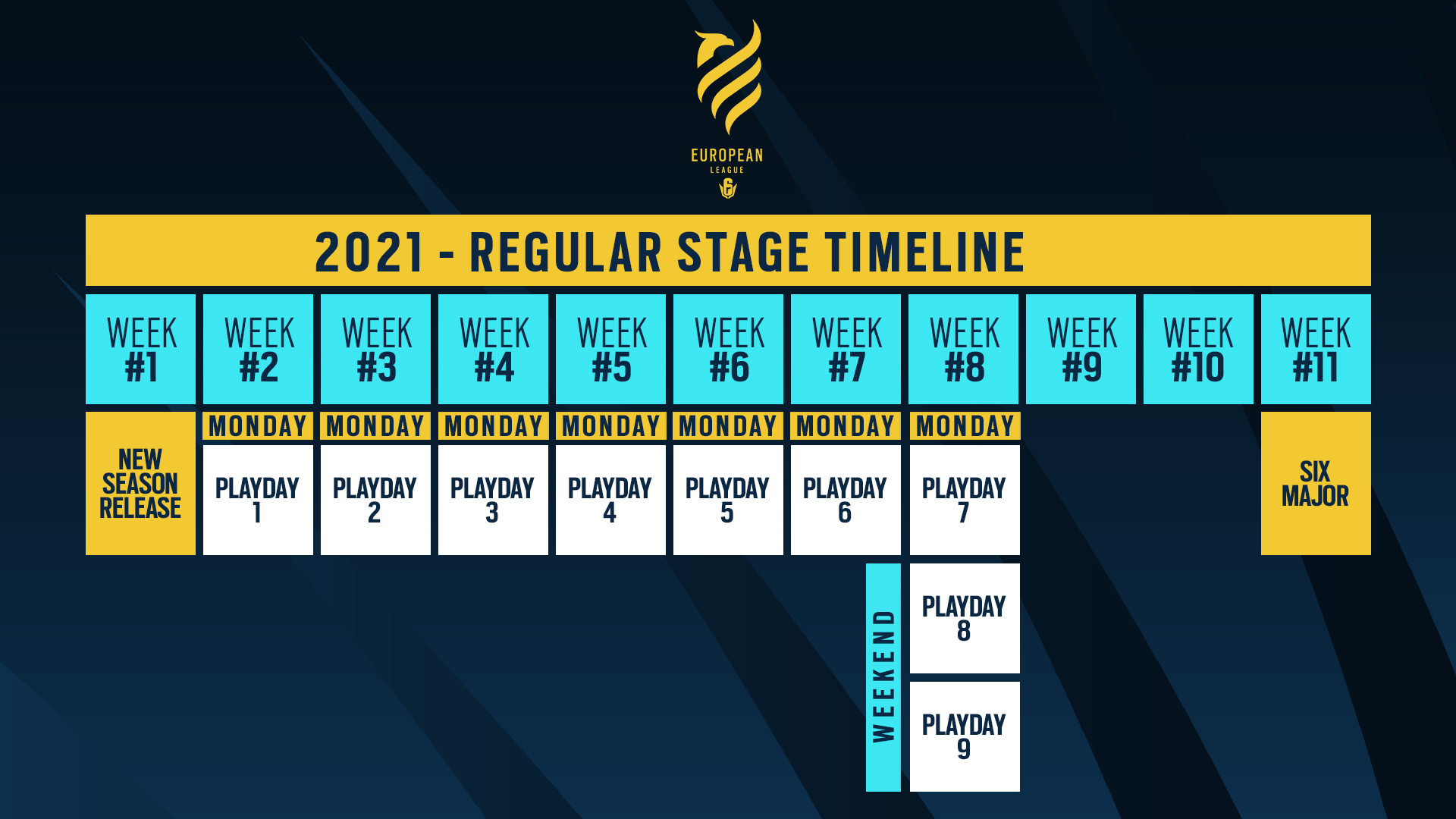 In Europe, the format of the competition will remain the same: an online round robin with Best-of-One matches. The nine playdays will be spread over seven weeks, with only one match per week for each team, on Mondays, starting at 6PM CET. The last two playdays will be played on a special weekend on the seventh week.