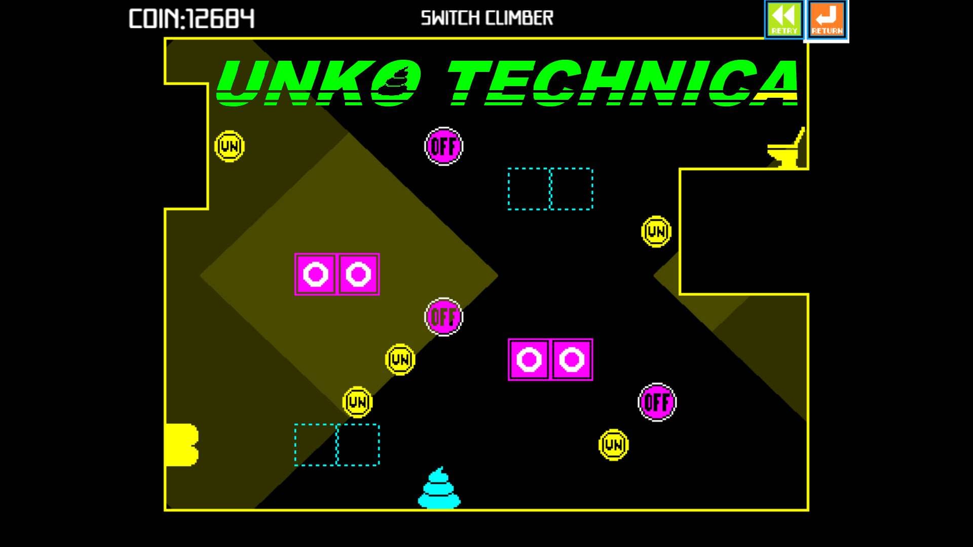 The only control in this game is "jump." However, with this single, simple action, you'll need to navigate over 150 diverse and challenging stages. A high-difficulty action game awaits you, where you'll repeatedly fail, learn from trial and error, and aim for the goal. Bouncing bubbles, crumbling platforms, walls of spikes, ON/OFF switches… As you advance, a variety of unique gimmicks will appear one after another. Overcoming the different gimmicks and traps on each stage requires quick reflexes and puzzle-solving skills. Retro-futuristic, neon-colored graphics and a catchy, cool BGM create a stylish atmosphere for the game. Spend the UN-COIN you collect in stages to spin a gacha machine for customization items for your Unko, or to unlock even more challenging stages. The game is packed with replay value, with tons of unique items to collect. Try to collect them all!