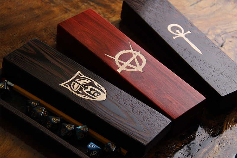 Elderwood Academy has something special for those especially diehard Vampire: The Masquerade fans: the Tome — a spellbook-styled game box with plenty of room for dice, pencils, notes, and cards. These one-of-a-kind spellbooks are carved out of dark walnut, bound in onyx leather, and adorned with your clan's sigil.