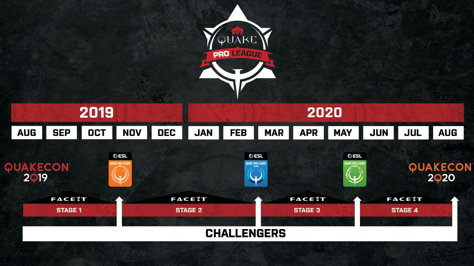 The Quake Pro League kicks off at QuakeCon 2019 and runs until QuakeCon 2020. The world's best players—10 from NA/SA and 10 from EU/CIS—will compete at QuakeCon 2019 to earn their Global Ranking and begin their journey in the Quake Pro League. A new competitive mode, Timelimit Duel, has been tailor-made for the Quake Pro League to showcase the insane skill these diverse players possess, allowing for a wider margin of control and the chance for fan-favorite comebacks. Following QuakeCon 2019, the first league games on FACEIT will start in August with weekly online studio broadcasts every Sunday. Offline Major and Minor events will occur during November 2019; February 2020; May 2020; and conclude at Quakecon 2020.