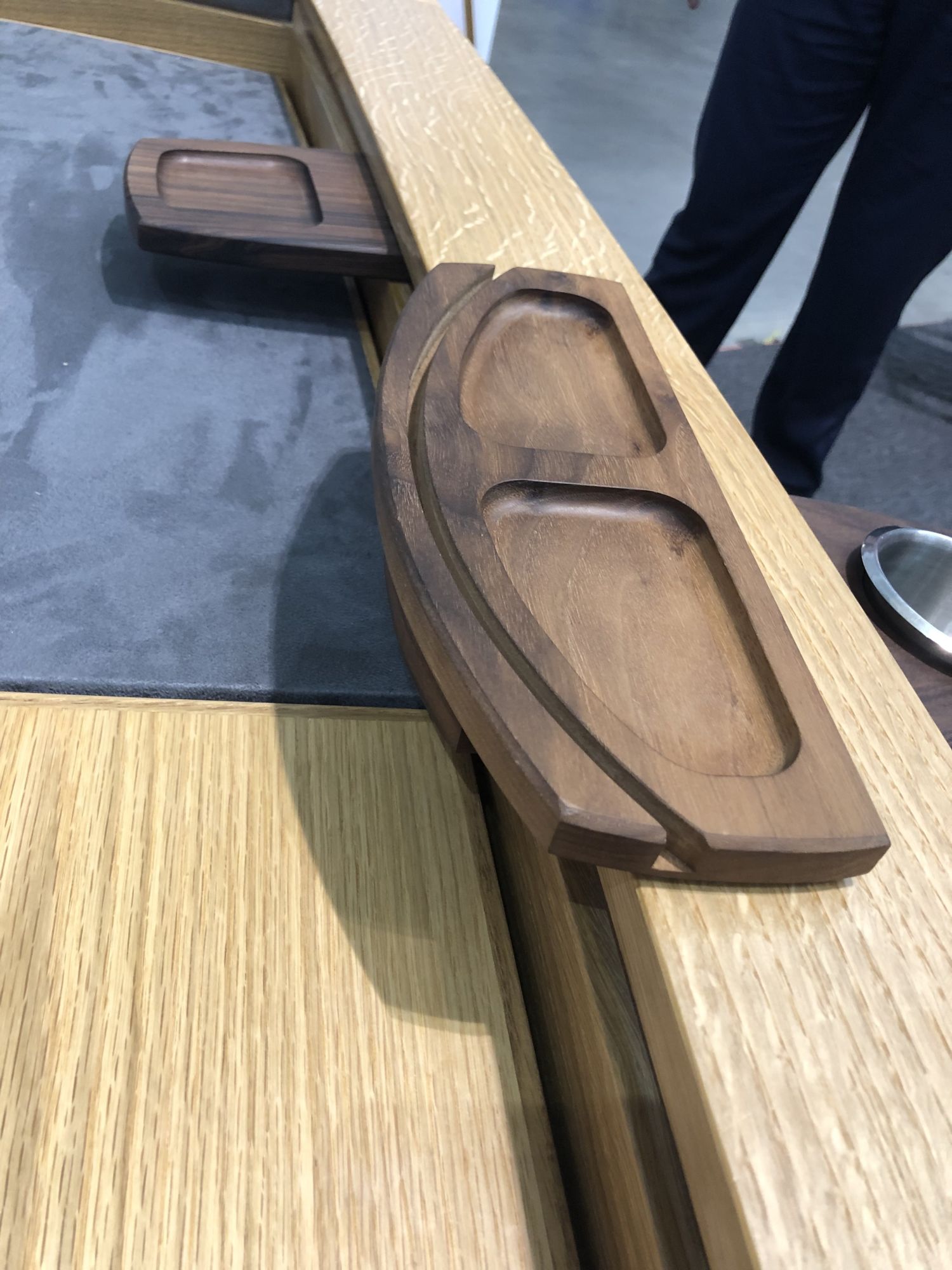 One of the coolest aspects were the cup holders and item trays that they had as a custom addition to each table. Both on the inside and along the outside there's a metal beam that has been magnetized. As you can see from pictures I took on the floor, they fit perfectly into the slot so you can hold a drink in one of the tin cups or you can remove it to fit anything from a soda can to a Big Gulp inside the circle. These can withstand 50 lbs of pressure, so shy of you slamming your fist down on them, they'll hold in place on whatever side of the bar you use it on.