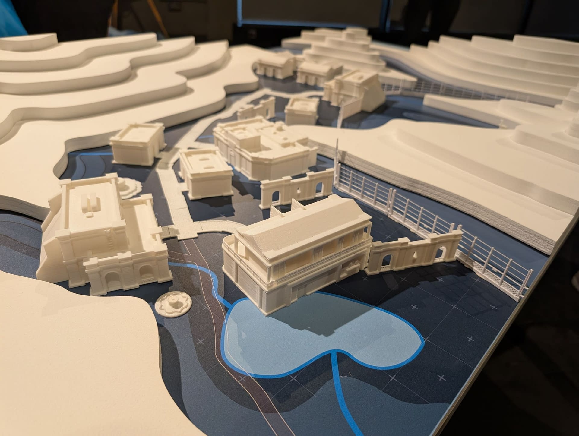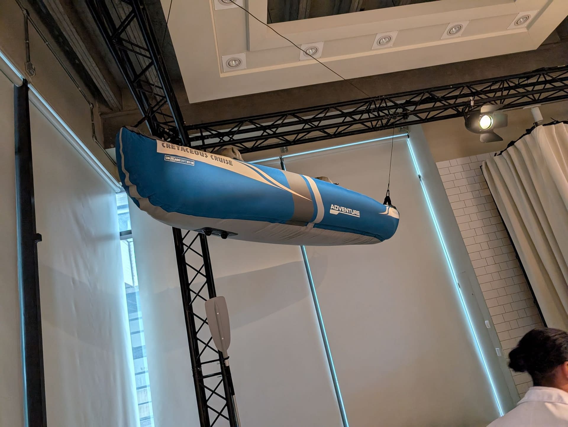 We were given a tour of a training facility within the Dinosaur Integration Network, all designed to prepare us for the simulation session (playing a demo of Jurassic World Evolution 3). They took us through a few different areas for fun. The first was a sort of Planning and Construction area where they showed us how we could use the terrain to our advantage while also showcasing the different types of buildings we could use. Different types of walls and fencing for various dinosaurs on display to keep them and people safe. Plus two new types of theme park additions, including hot air balloon rides over the park, and the Creatacious Cruise, where you take a kayak down a river near the dinosaurs.