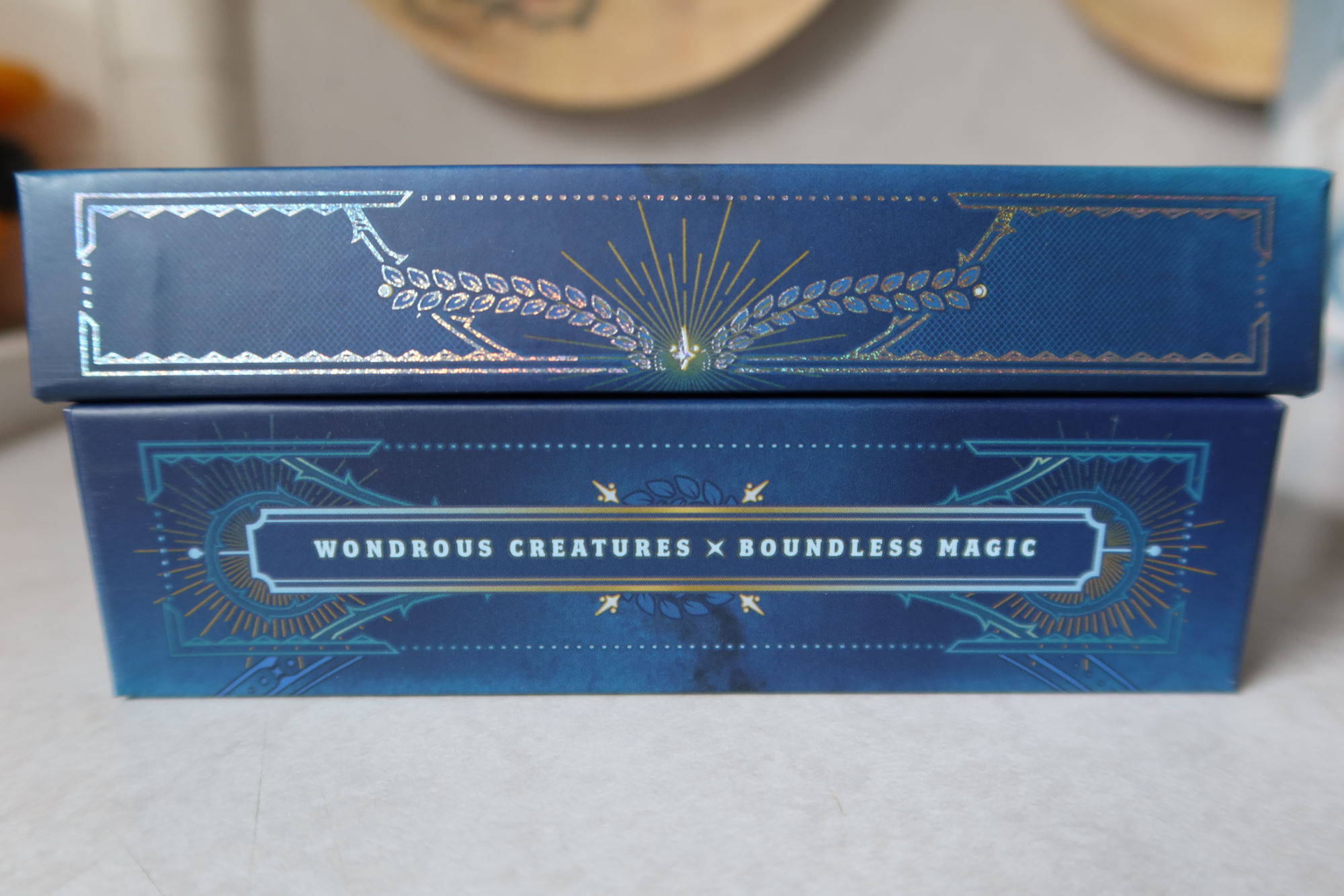 First off, let's talk about the box. This is a mighty durable box to keep everything in that is lined with felt, and both the top and bottom can be used as dice trays. The design on this is spectacular as they went all out to make this a box worth owning. On the top, bottom, and all around the edges are silver designs that shimmer on reflection, along with small phrases such as "Together in harmony, our stories are told." You even get a quote from Laeral Silverhand herself on one of the sides. This is one of the best box designs they've created for their dice sets, especially since some of the newer sets over the past couple years have been bringing their game hard on the look.