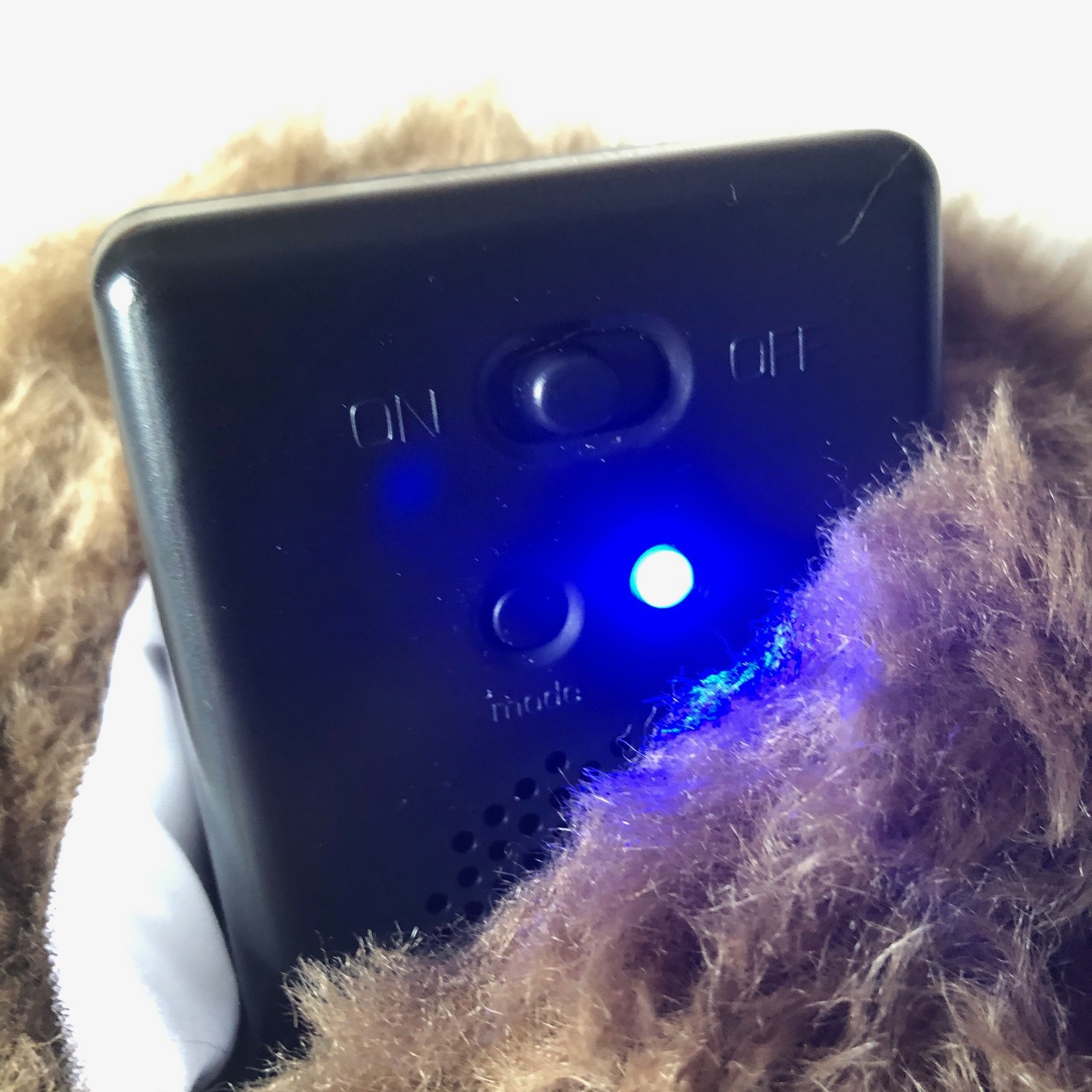 So first and foremost, let's get right down to the design. For those of us who have traveled to hundreds of conventions and seen Tribbles in bags and boxes, two things tend to remain the same for most of them. The hairstyle and the softness. This one is no exception as it is a light-auburn hair and a good amount of fluff inside to make it squishy. There's also a built-in squeaky toy to simulate the sound when you pick one up and hold them tight. We grabbed and bounced and squeezed our a ton to make it squeak in different tones and it sounds pretty much like the original version you hear on the show. But we couldn't do it too hard as there is an electric device inside. As you can see from the photo below, held in a velcro pocket is the sound and vibration box that makes it all happen.