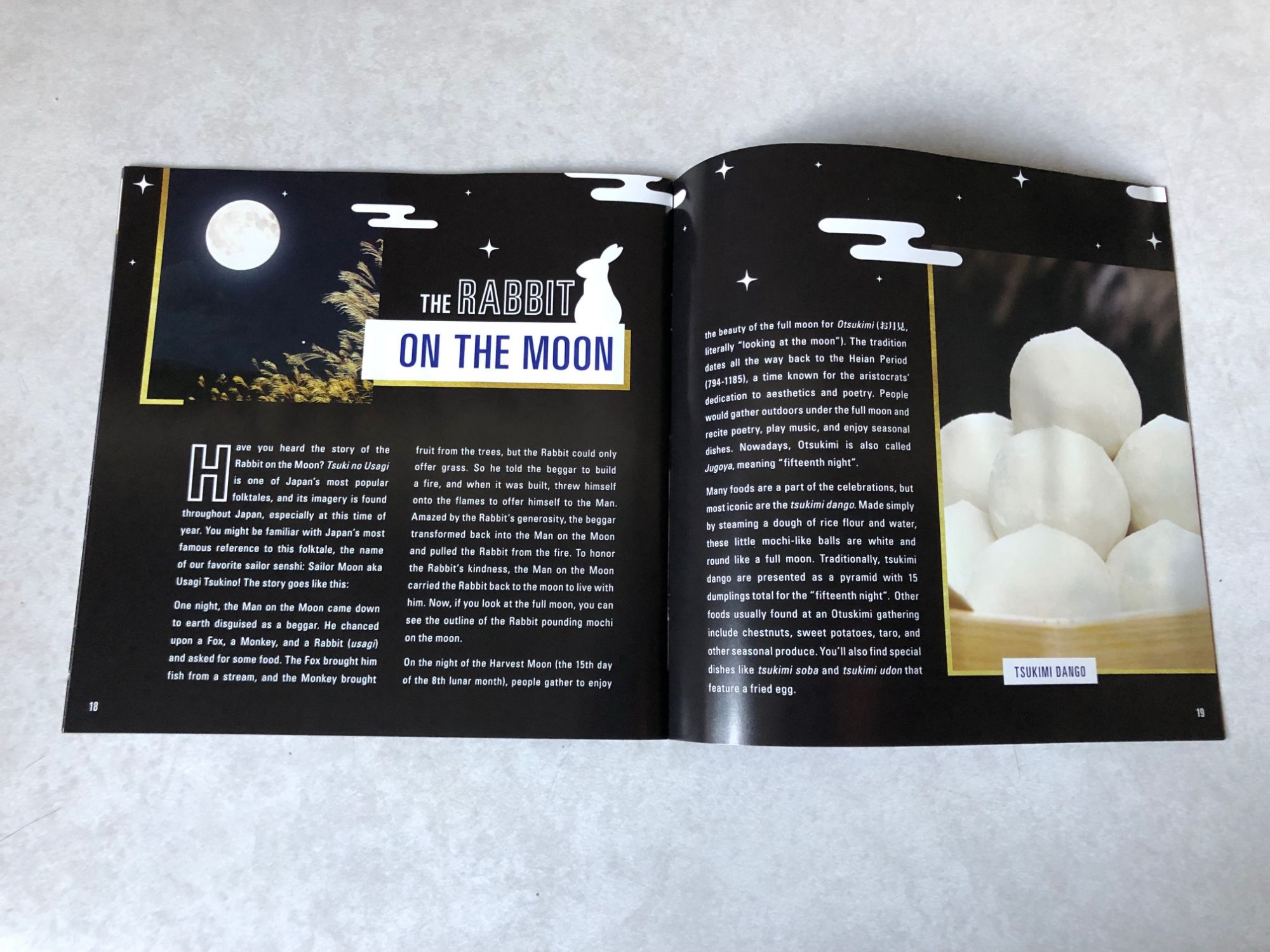 As mentioned before, every box comes with its own booklet to tell you what you're eating. I love this because this is far more in-depth than a lot of other subscription boxes you'll see. As you can see here, this one talks about all the food you got, where in Japan it was made or came from, and what's in each one in case you have any allergies. The book also comes with stuff like learning Japanese with words and kanji, and this one even had a section teaching you about how mochi is made and the Moon Festival. There was even a recipe of how to make Tsukimi Dango yourself! That's one helpful little booklet!