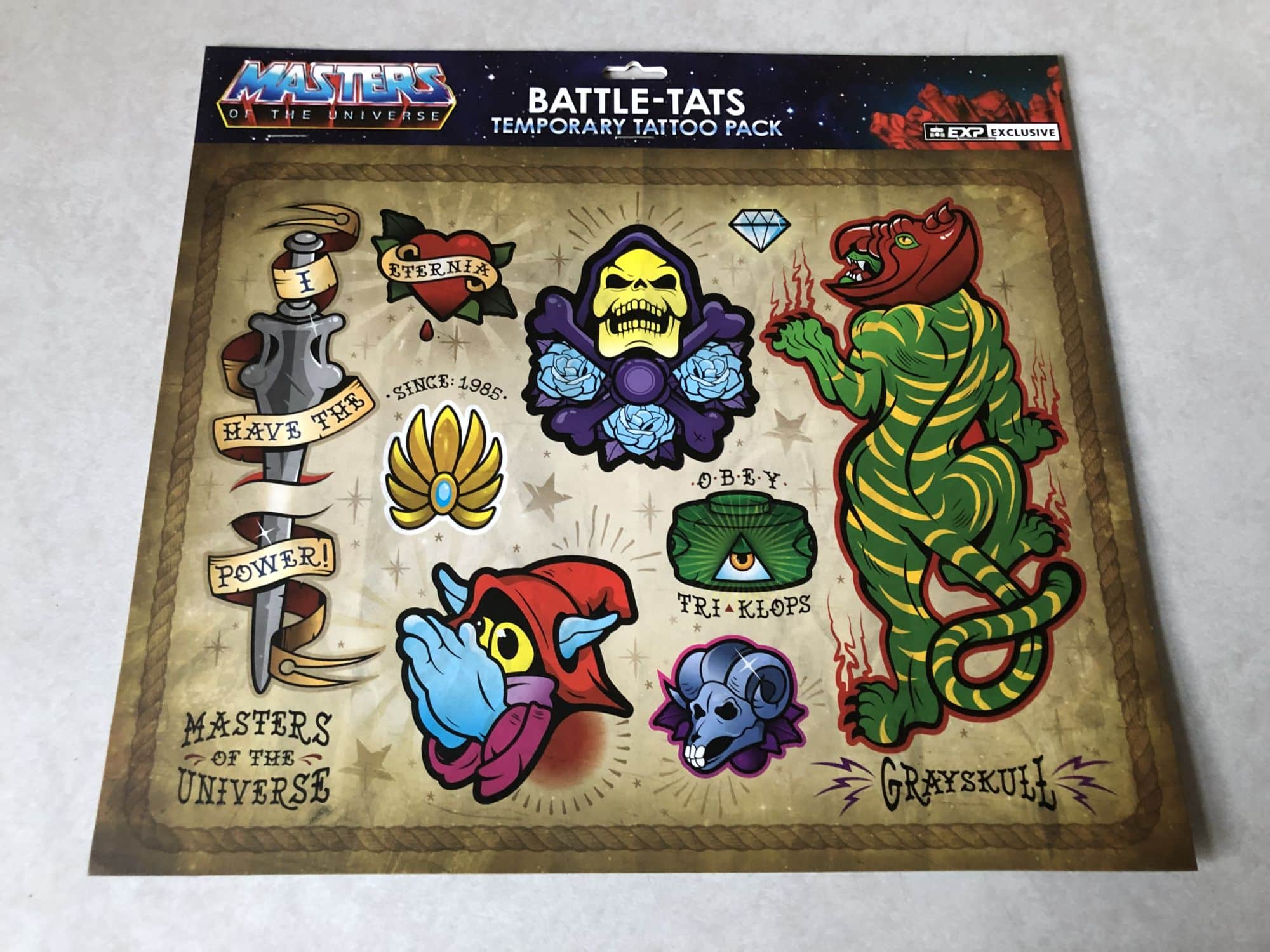 Next, we get to some He-Man goodies as we are first treated to Masters of the Universe temporary tattoos. This is a nice little collection of stuff from the cartoon, and yes, we absolutely fell in love with that Skeletor design. They're your basic rub-on tattoos that come off in a day or so, which was kind of disappointing as we were hoping they'd last longer. There are two sets of tattoos for you to go through in the pack, I recommend saving them for conventions.