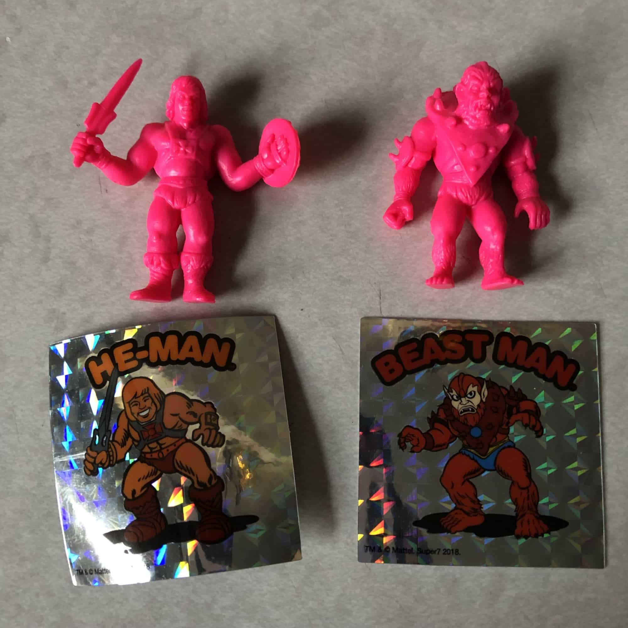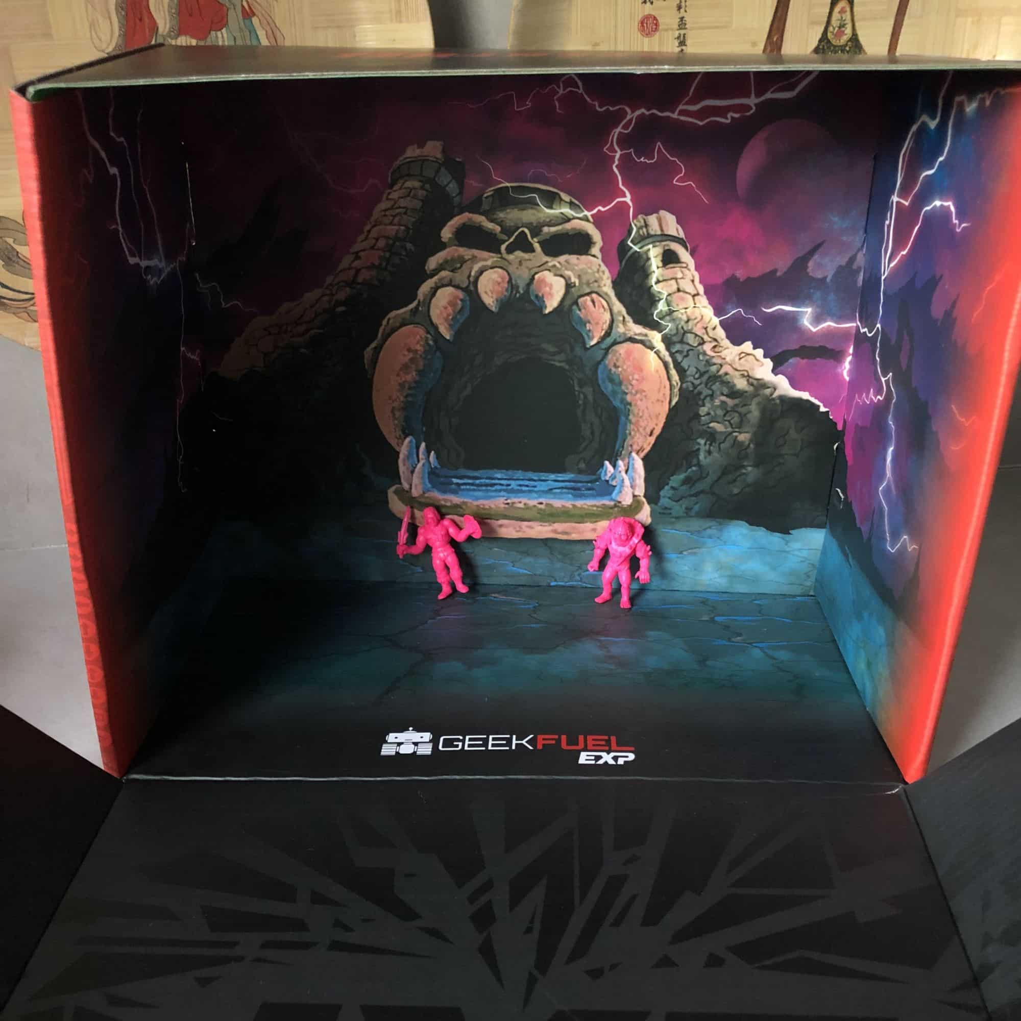 Next, you get some Keshi Surprise figures, the two we got were He-Man and BeastMan (with the third being Skeletor, which did not come with this set). These are basically just pink figures you can stand up anywhere. They both came with holographic stickers, and the Geek Fuel box itself is a small playset outside Greyskull for you to fight at.