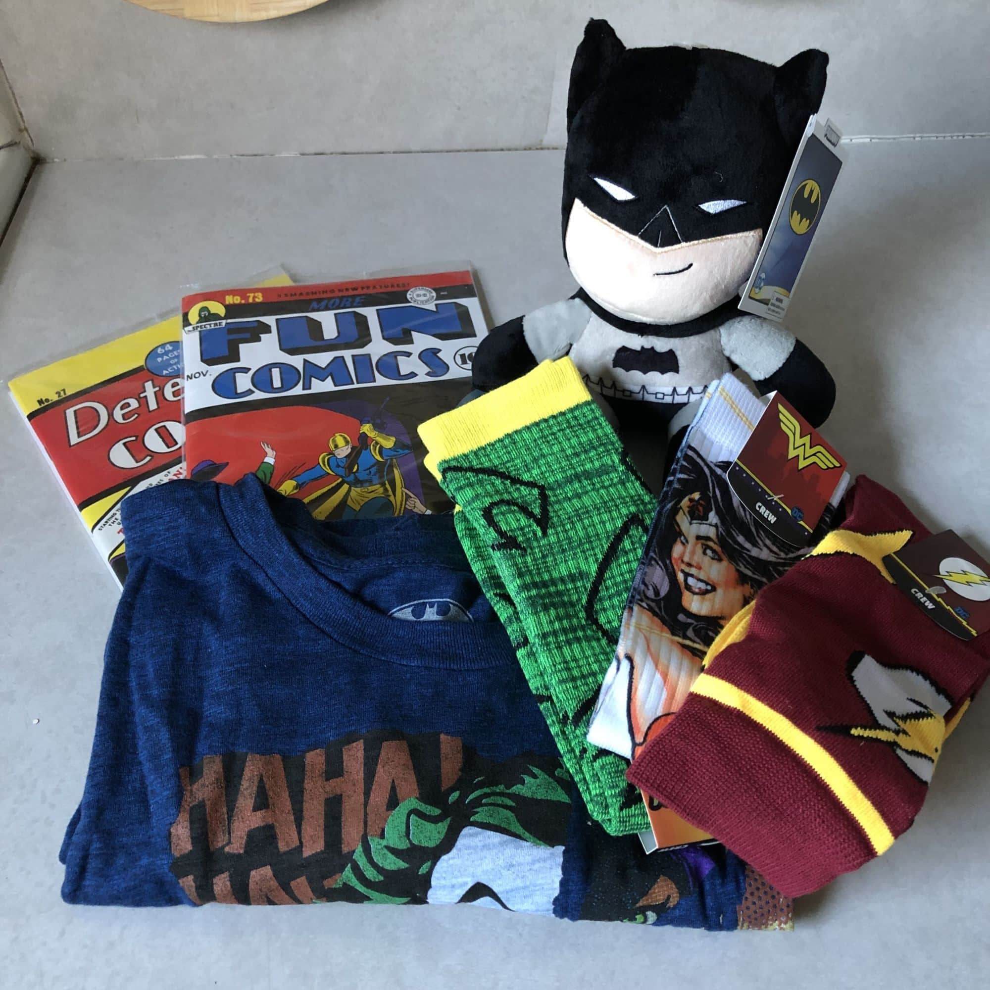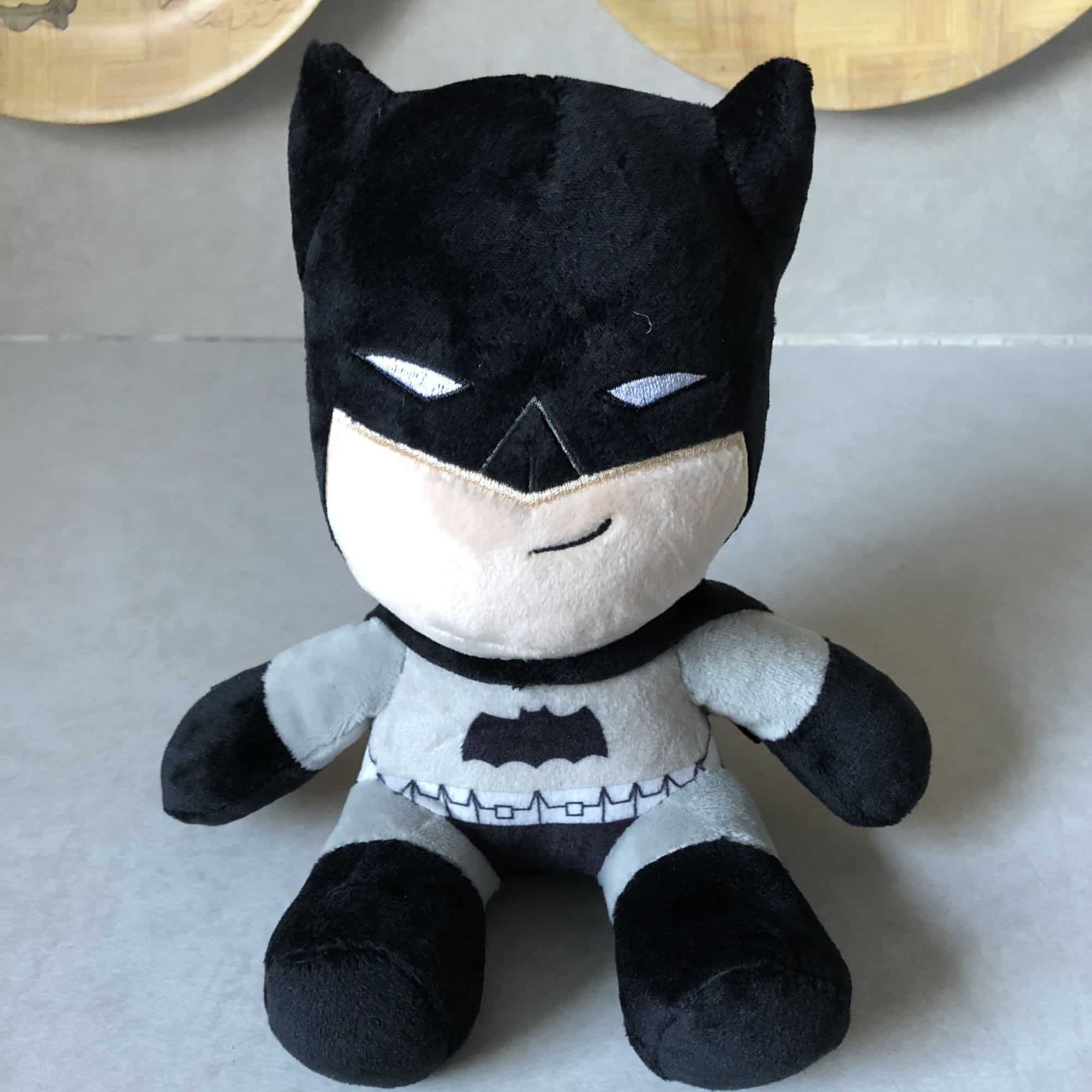 This box was a little lighter than normal, but it was all-things DC comics this time around. And we start with a fun item as we have a Justice League Dark Knight Batman plush doll. So the name that I just said is the exact name of this doll, which is confusing because you can't truly know what incarnation of the Justice League they're channeling for this one. Doesn't feel like any of the animated versions because the grey is too light, and it's not the film with Ben Affleck, so it's hard to really tell which source they're claiming. In any case, we have a Batman plush, and that's really all that matters. I liked this regardless, even though it's weird having a Batman kinda smiling.
