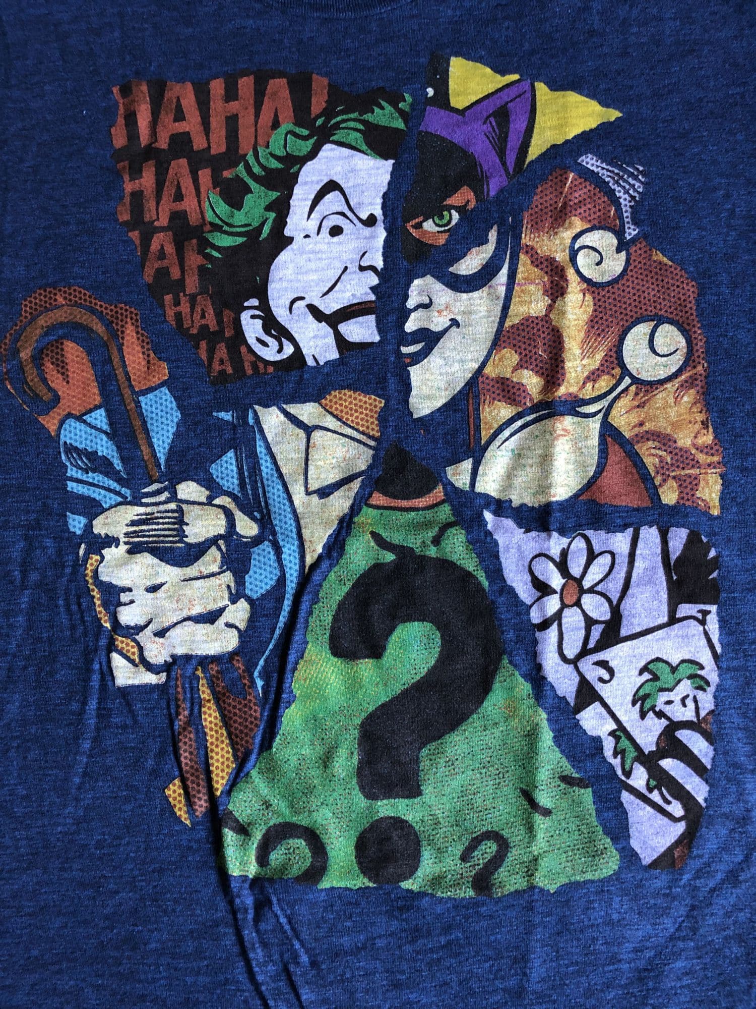 Finally, the make-or-break item of the box: the t-shirt. This month is an absolute must-have as we get a Batman shirt featuring a fractured rogue's gallery. On this shirt, in different pieces, you have comic book versions of Catwoman, The Joker, The Penguin, The Riddler, and Harley Quinn. I wish a few more had been added to the mix, but it's a shirt and you're trying to do it justice without diluting the print with nonsense people may not see immediately. You see this and you know it's a Batman shirt. I love these designs on a deep but faded blue. This was a winner.
