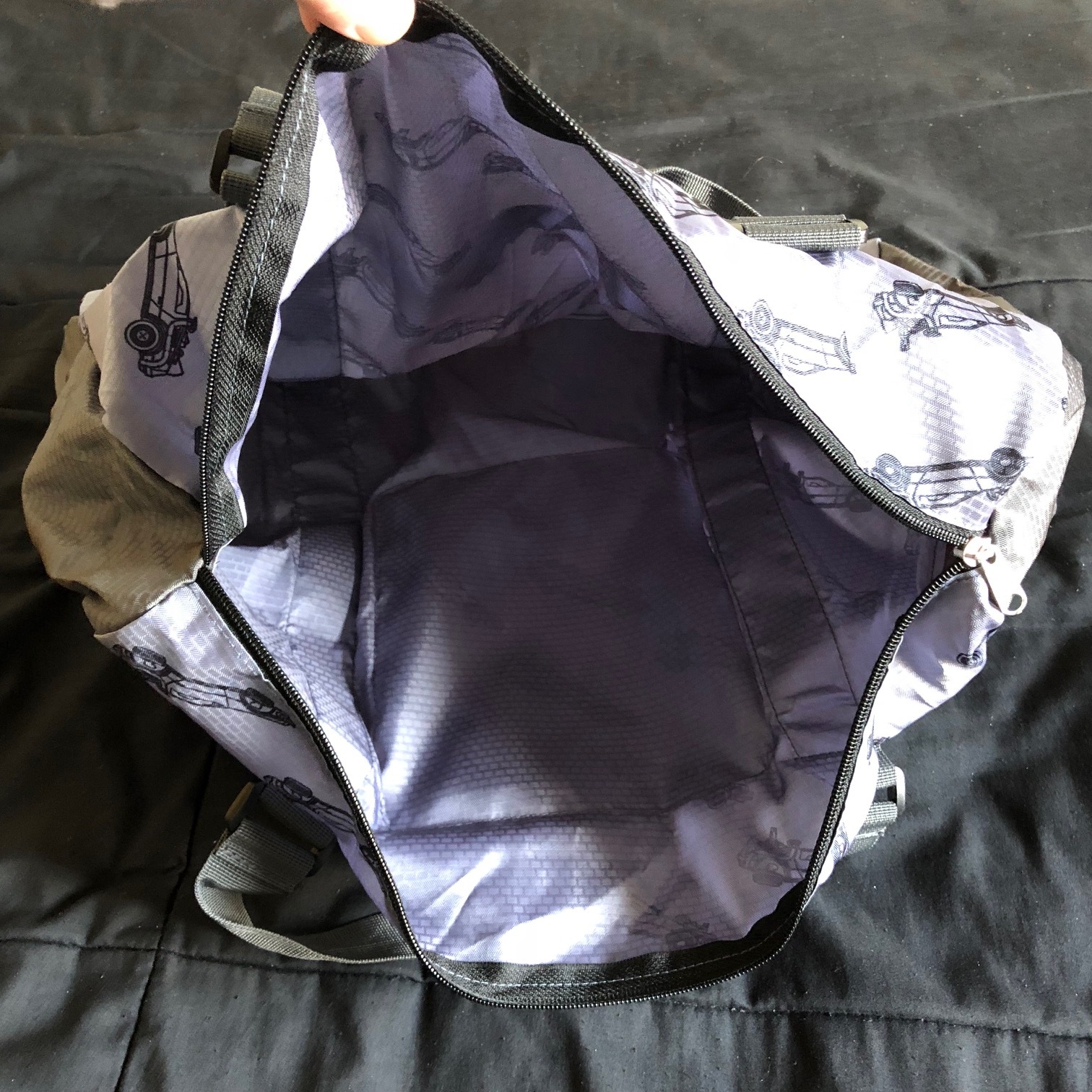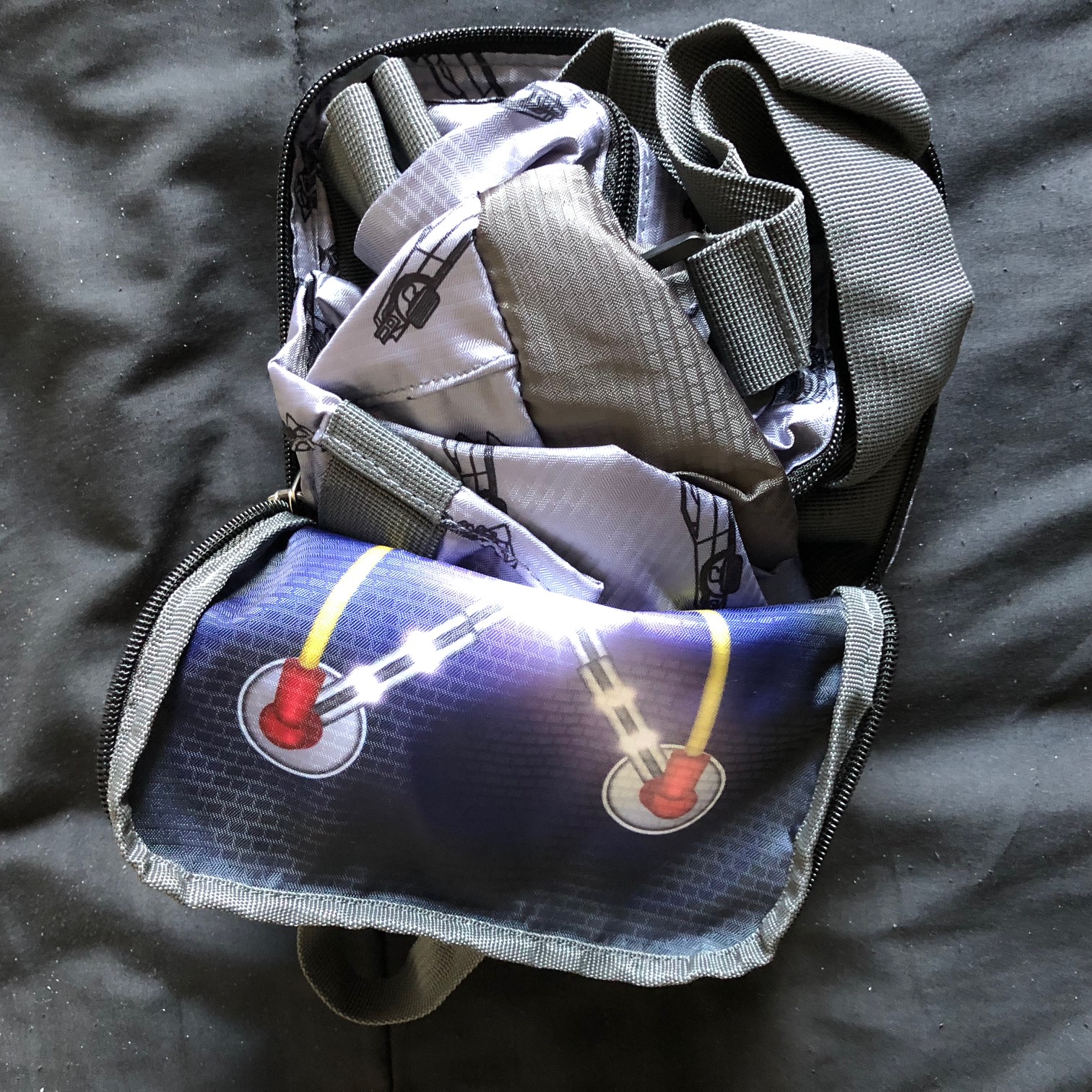 Another '80s throwback is this Back To The Future collapsable duffle bag. As you can see from the pictures below, this is a medium-sized duffle that folds up into a small pouch. The small version shows off the Flux Capacitor, and when you unfold it you get a cool sleek great bag with a DeLorean pattern that shows off the different incarnations of the car over the trilogy. This is something I'll actually put to use going to conventions as I usually end up with extra stuff than what I brought with me. No complaints about this at all!