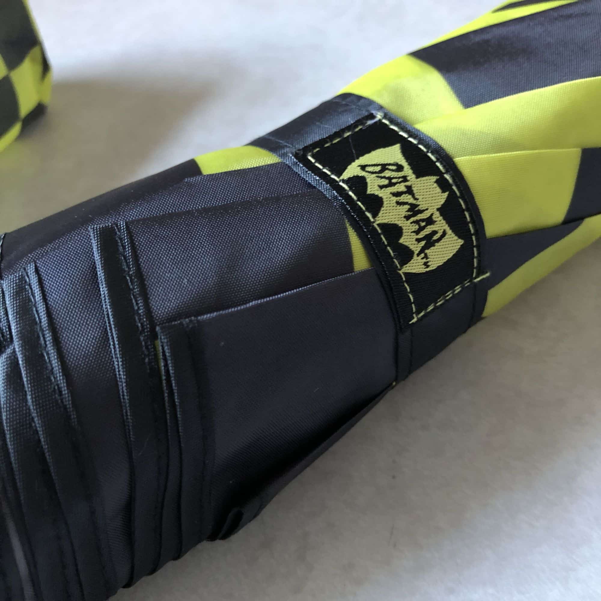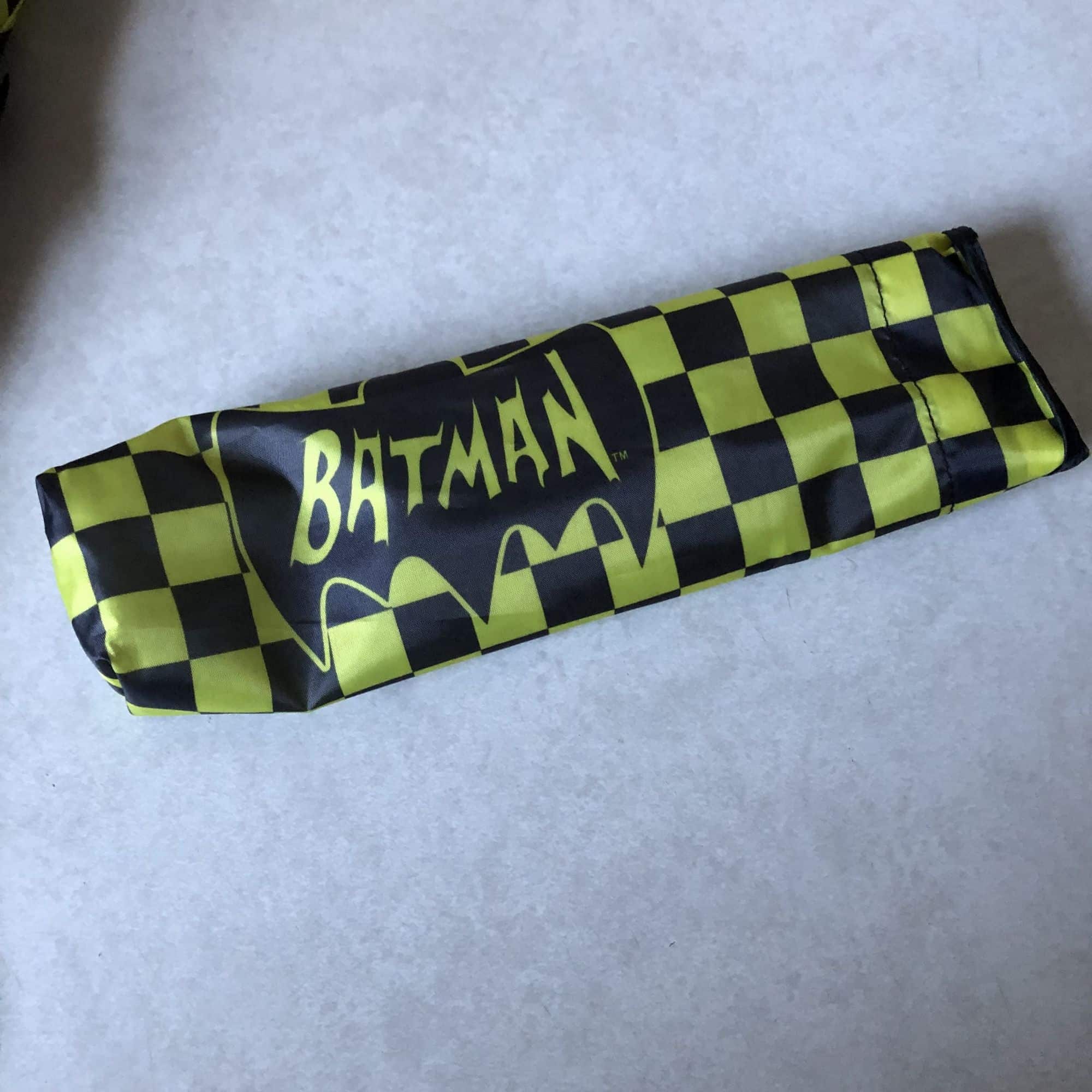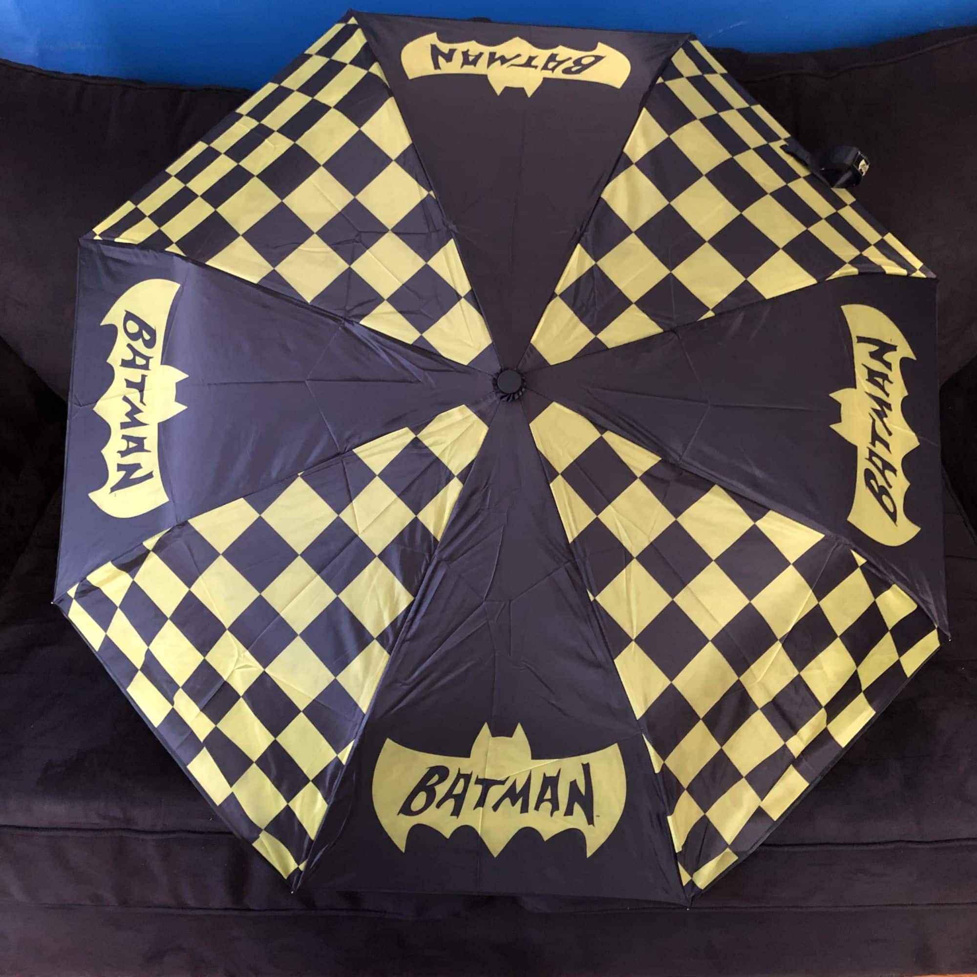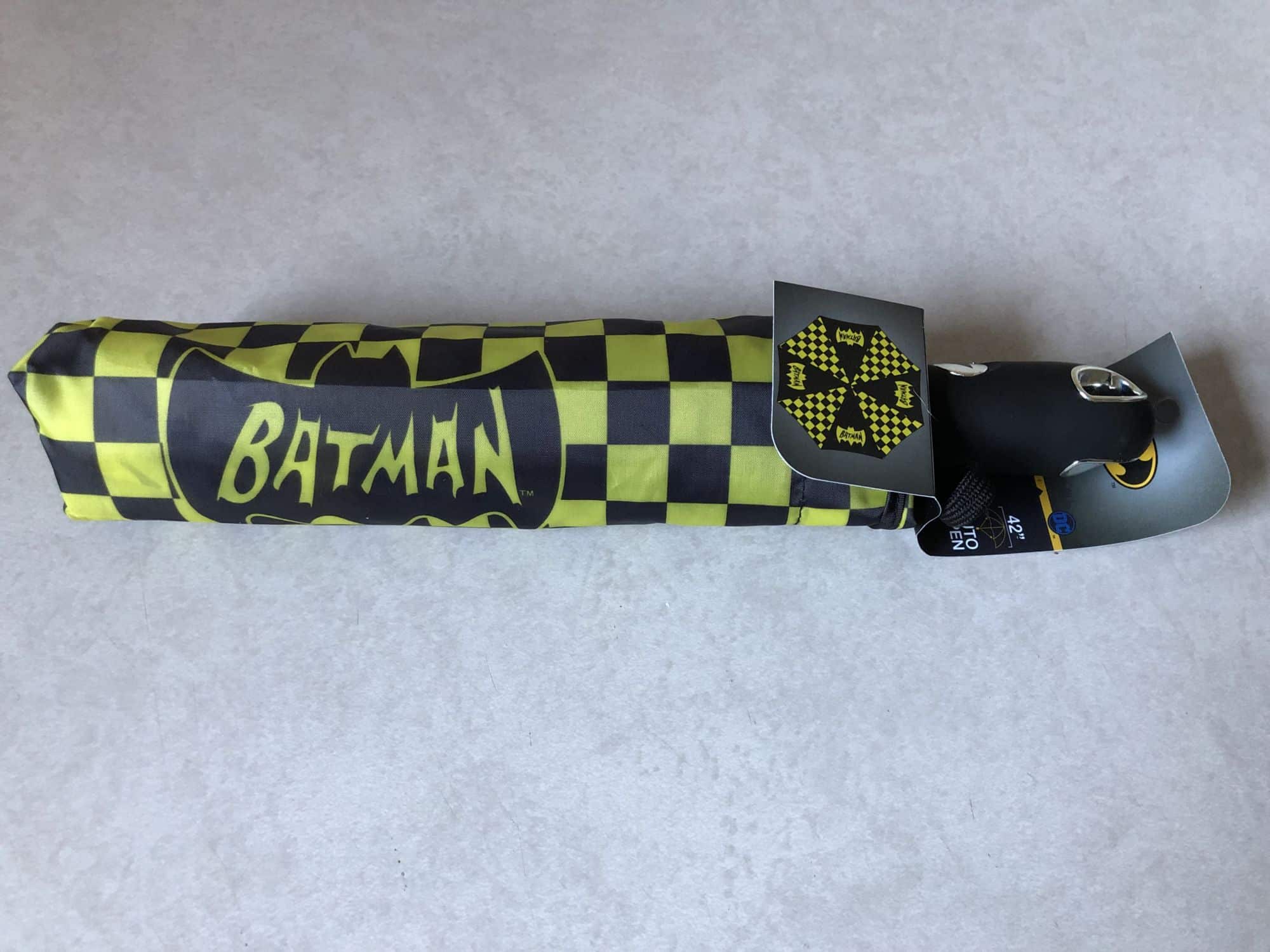 Next up, we get a little bit of a Batman flair with this Batman Umbrella. Now to be clear, this is to resemble the 1960's version of Batman, as you can see from the style and the logo on the side. It operates like any solo-person umbrella, complete with a wrist guard, a push button, and hook ring on the handle. The design is kind of funky as you get a yellow and black checkers pattern mixed with the Batman logo, but I kinda dig it. I was in need of a new umbrella after my current one broke this summer, and this is a great replacement as it does everything that one did, with the exception of auto-close. This one you manually have to reach in and pull is down.