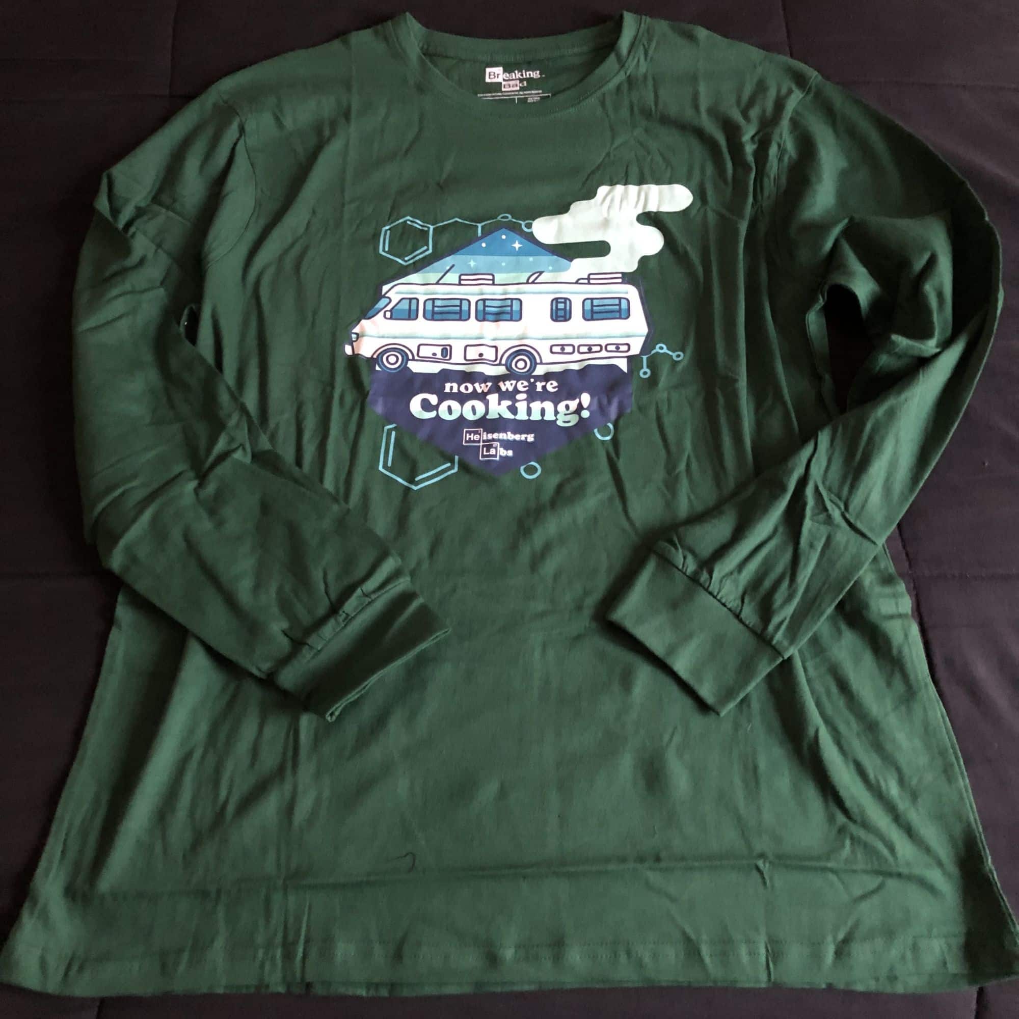 Finally, the make-or-break item of the box, the t-shirt. Since it's the colder months we got another long-sleeved shirt this month. Since we're in the labs, we got one of the most famous ones in pop-culture with a Breaking Bad shirt showing off the RV that Jesse and Walter White originally cooked their meth in. The design is kinda funny as it says "Heisenberg Labs: Now We're Cooking!" with the shade of green that takes you right back to the series. I love this design, especially the way the capture the New Mexico desert, the chemical symbols, and just the vibe of the show in a playful shirt. This is a winner, hands down, can't complain about anything.