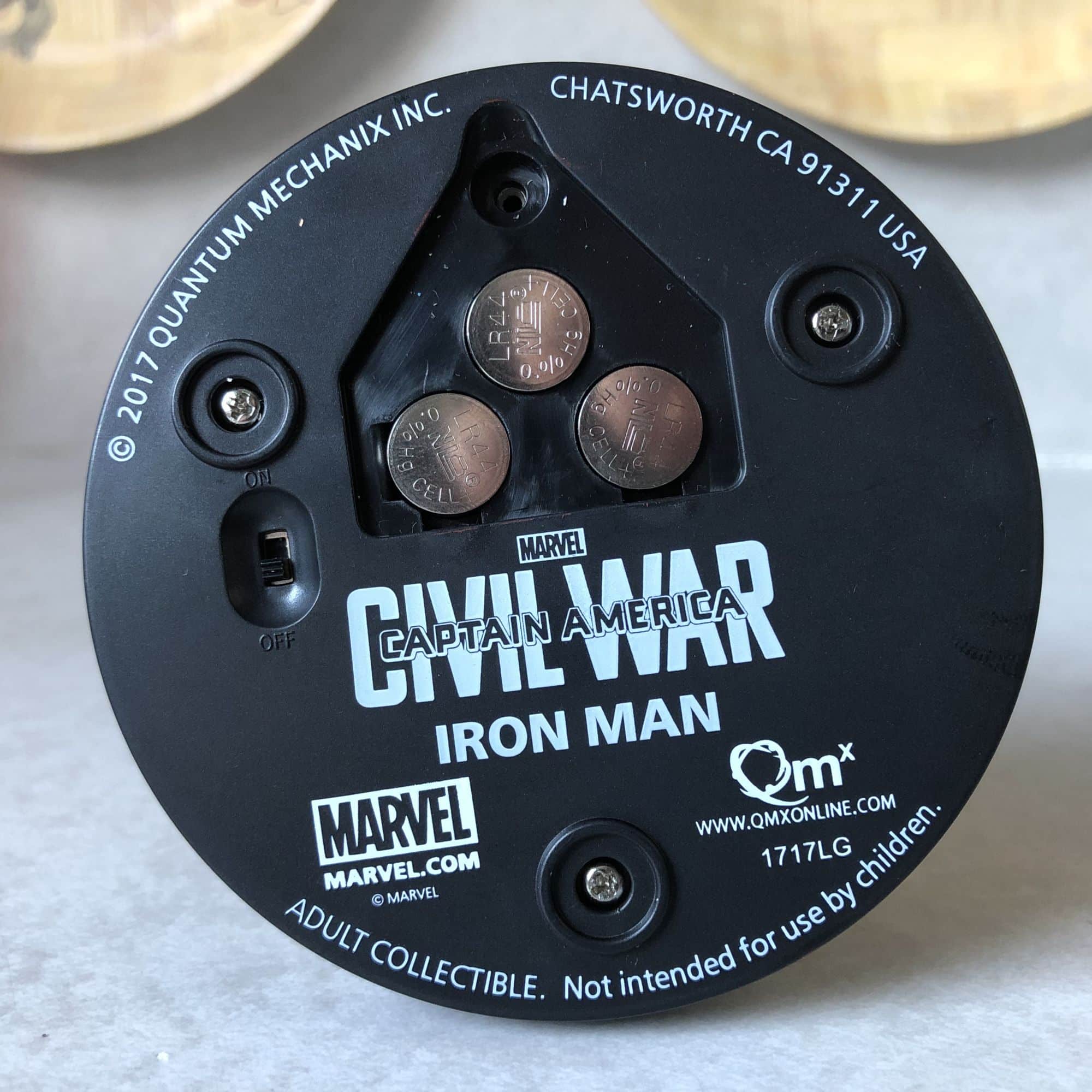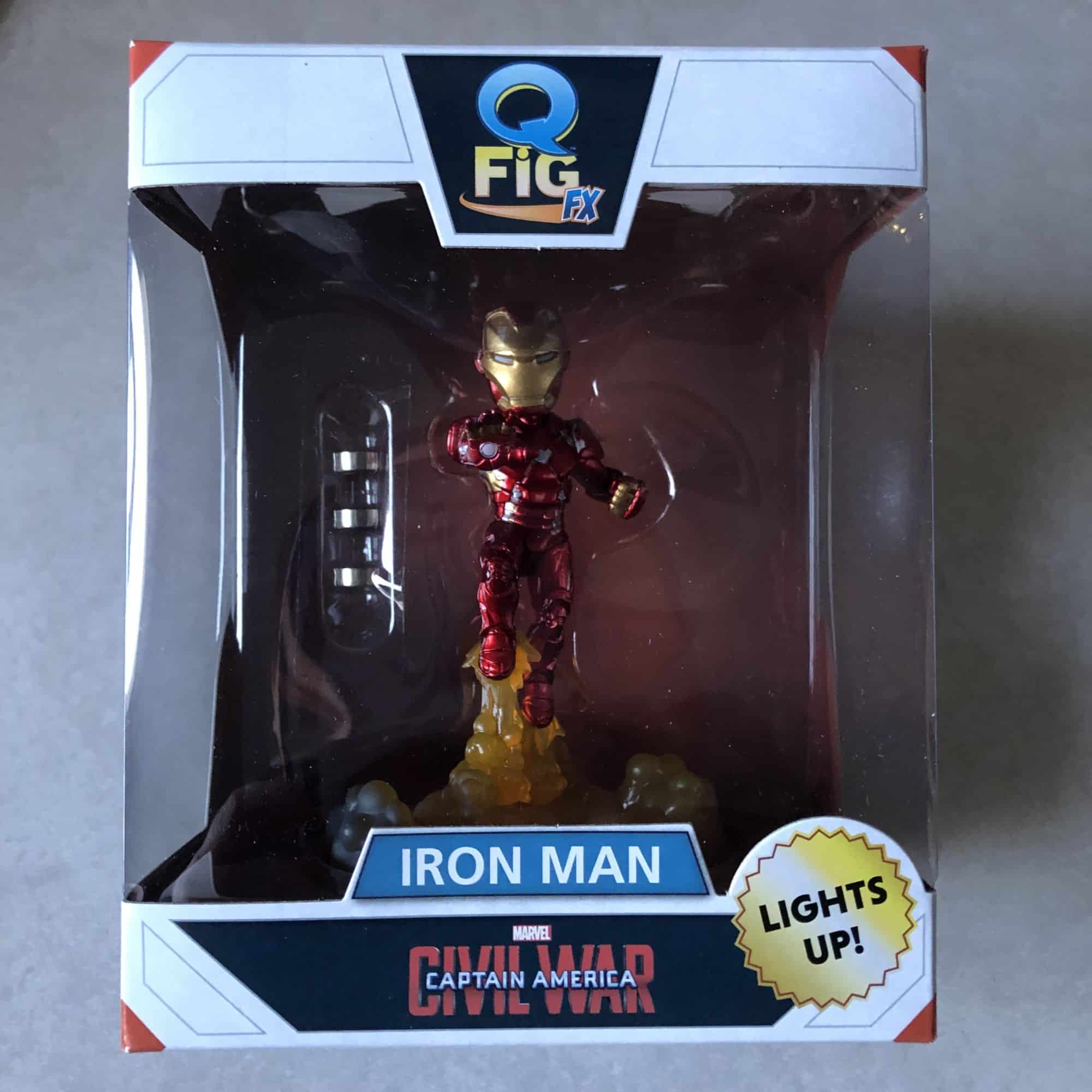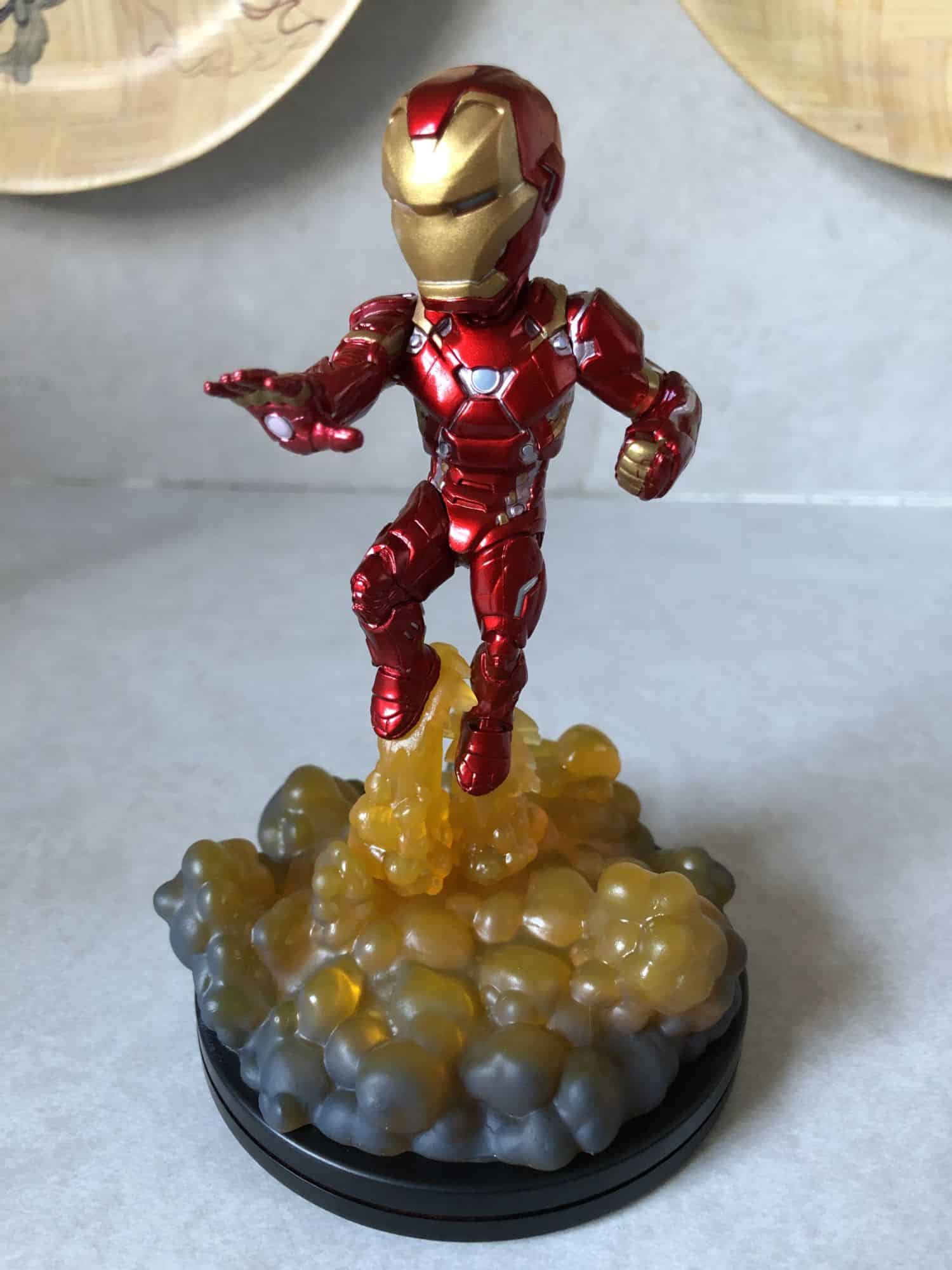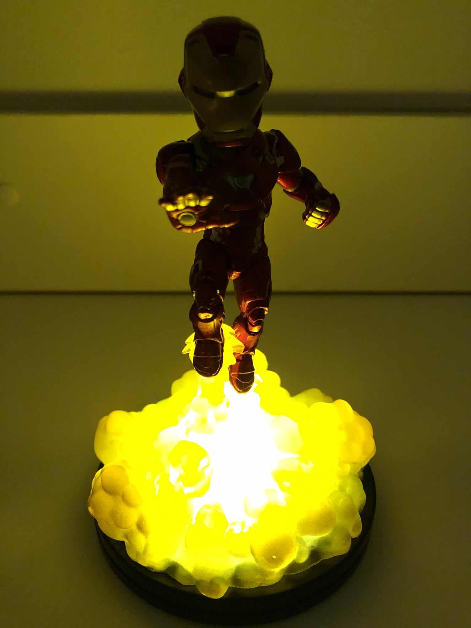 Next up, we have an Iron Man Light-Up Q-Fig from their FX Diorama series. Here we get Tony Stark gussied up in one of the designs between Iron Man 1-3, still sporting a round chamber on the front for the power source. You got him blasting off from the ground in a fury of exhaust below him while preparing to fire from his right hand. So the big selling point on the figure is that it lights up using three button cell batteries, which were thankfully included. The effect is kind of cool, as you can see from the photo we shot in the dark below, but it's not super bright. It's basically a nightlight at best. It might have been better if parts of Iron Man lit up as well, but not so lucky on that front. Makes for a good desk figure to display, but don't look to make this your new desk lamp.