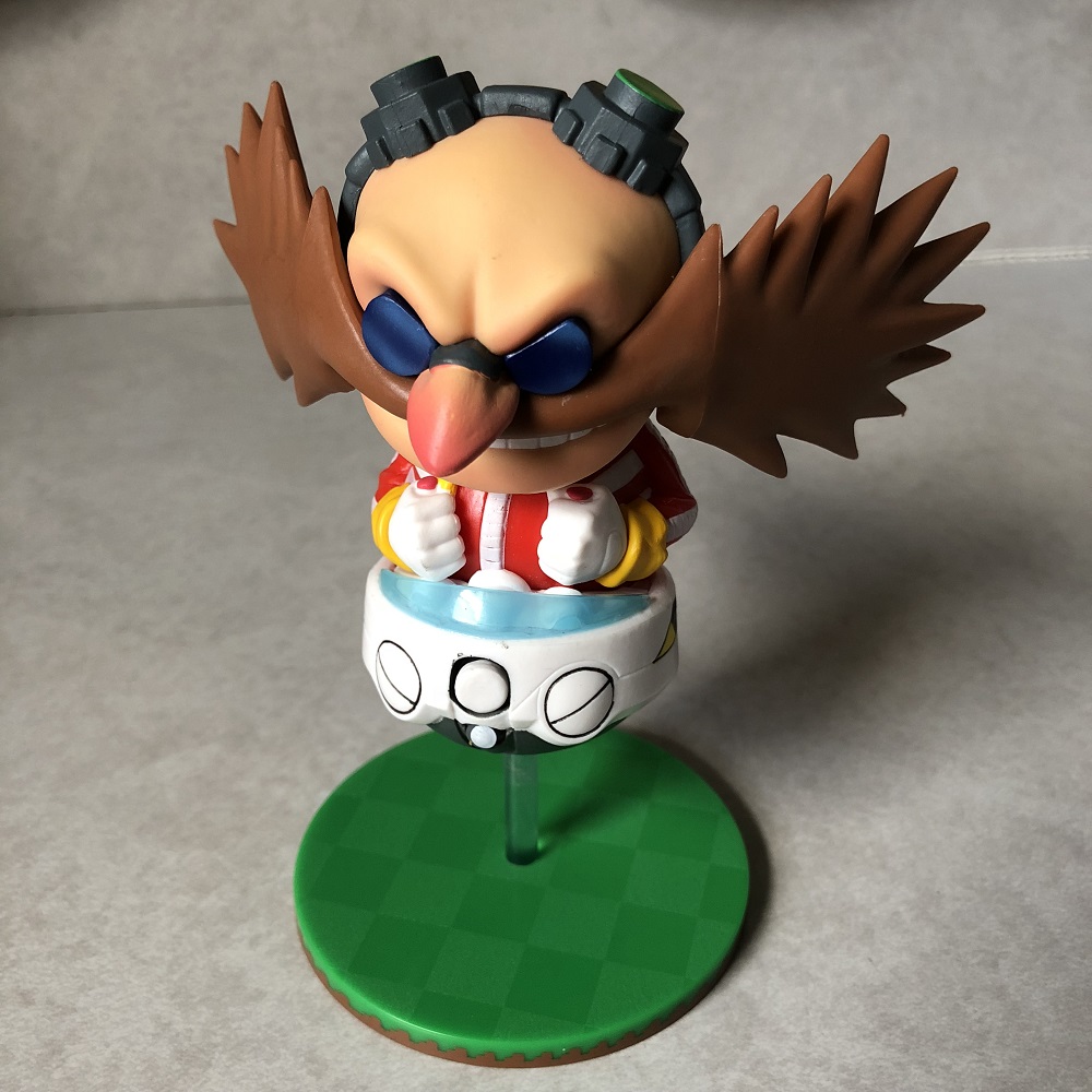Going back to Sonic for the next two items, the first is this Dr. Eggman collectible figure. He doesn't really do anything except pose in mid-air, but this is an awesome design of him inside the Egg Mobile, waiting for Sonic and his friends to drop by as he unleashes his next robotic creation on them. While the figure itself is awesome, putting him together was a great challenge because the version we got had a misshapen peg. It fits into the base just fine but was too big to fit into Dr. Eggman so he could sit in it. We nearly cracked the base getting him to stand up and ended up taking a blade to the stand so it could fit properly. A bit of a disappointment putting him together, but a nice addition to our shelves once he was done.