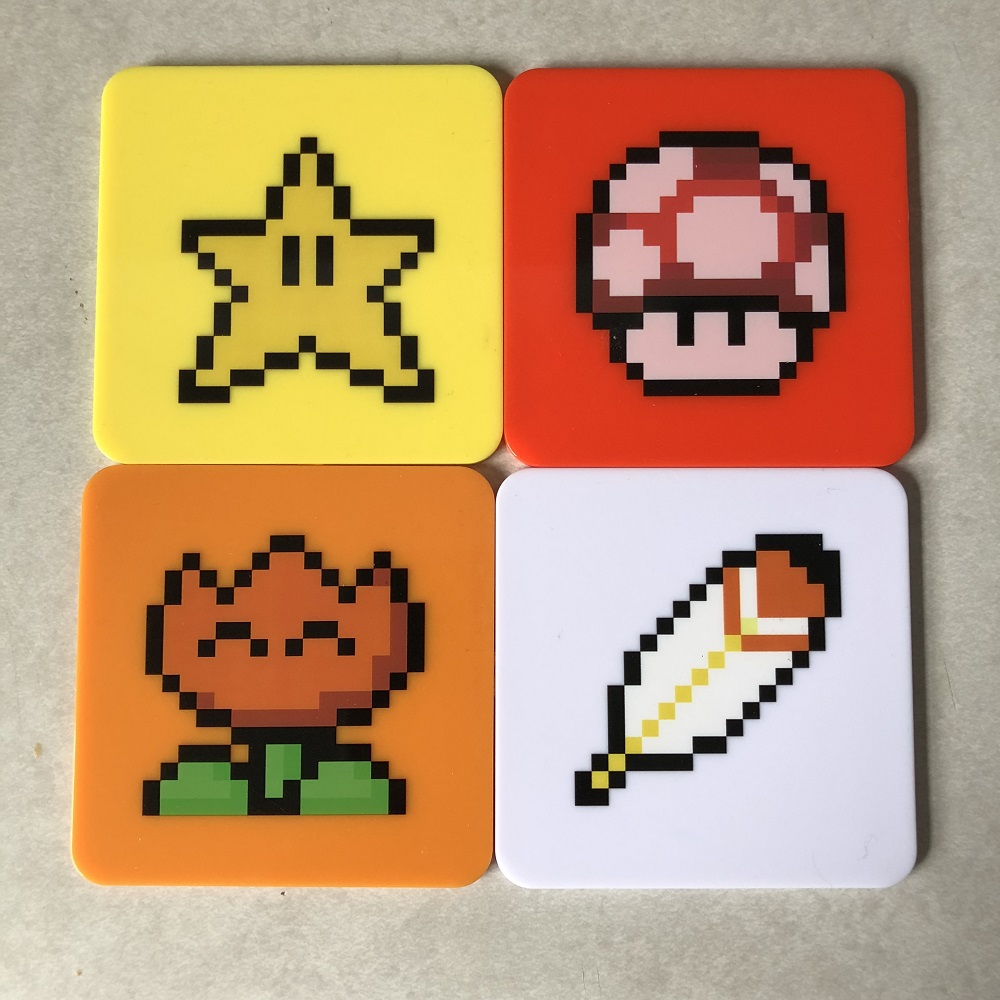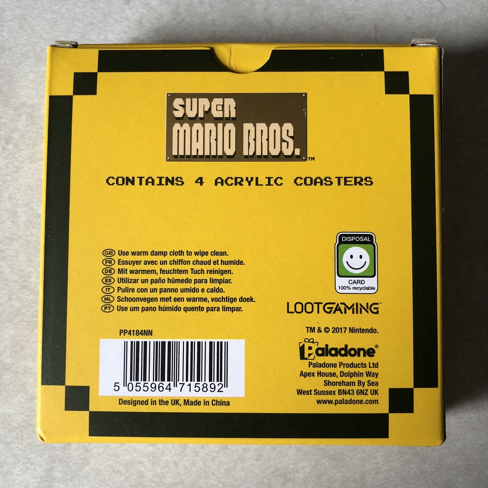 This month's theme is "Boss Battle", or Platforming Games for a more general approach. The first item out of the box are these Super Mario Bros. coasters. While they're labeled as the Bros., the white coaster with the feather is a clear indication this artwork is taken from Super Mario World. These are some pretty decent acrylic coasters with the feather, mushroom, fire flower, and golden star designs all properly displayed so people can pick their favorites. The only drawback is that they don't have a cork bottom like other coasters normally would, so you need to be a little extra careful with them to make sure they don't scratch up whatever surface they're on. Beyond that, these are great!