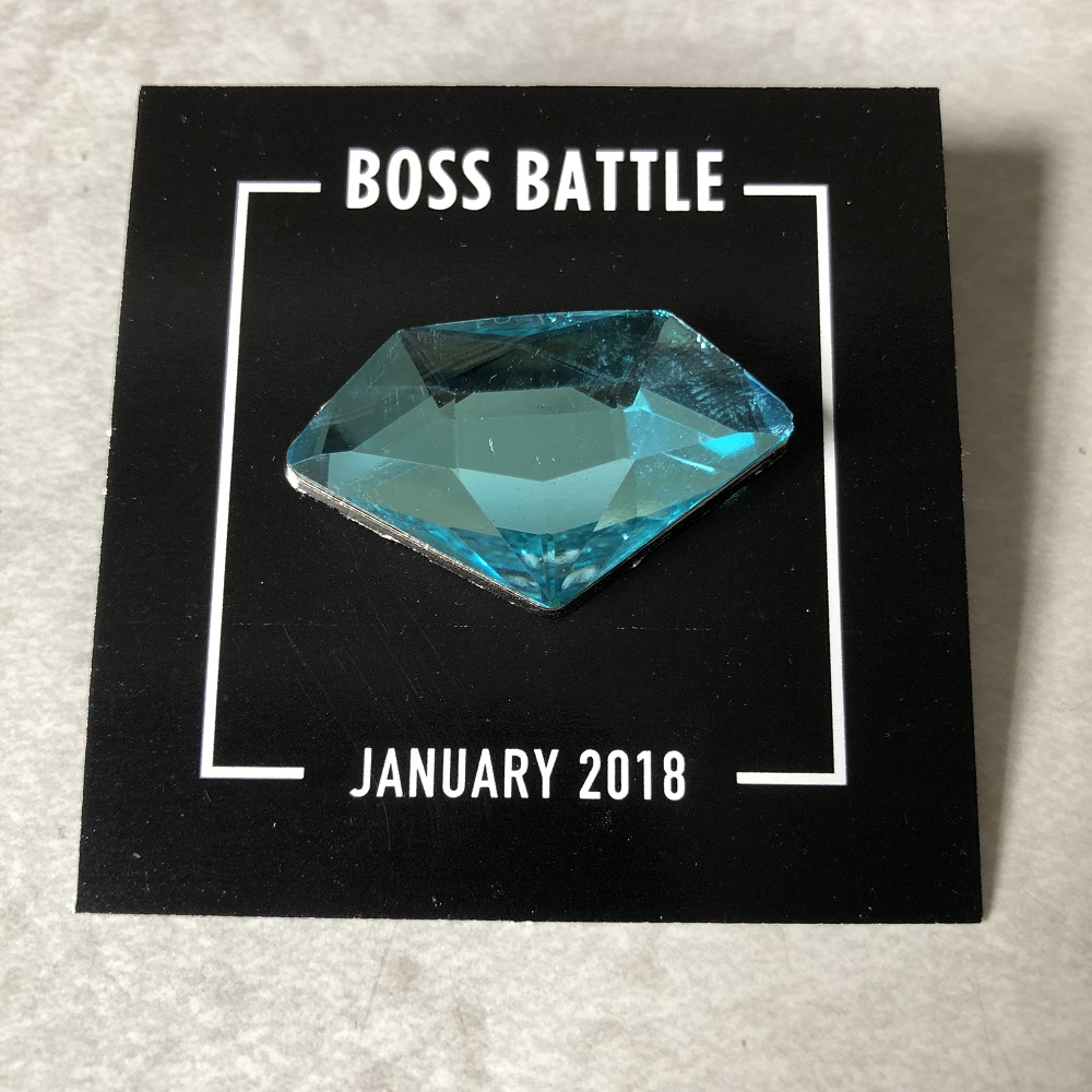 Next up is this month's pin, which takes a page from Sonic The Hedgehog (as a few more items will) by being one of the Chaos Emeralds. We got the blue emerald, but there was a random chance of getting any of the seven colors with no rarities. You can buy all seven at the loot vault if you really want to, but each one is a candy plastic design with a metal stopper on the back. I wish the Loot Crate pins would switch over to a rubber stopper to prevent scaring and torn clothing with the metal backs, but we have to make due with what we got.
