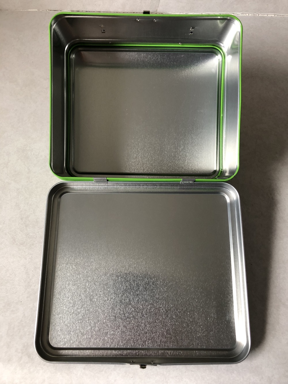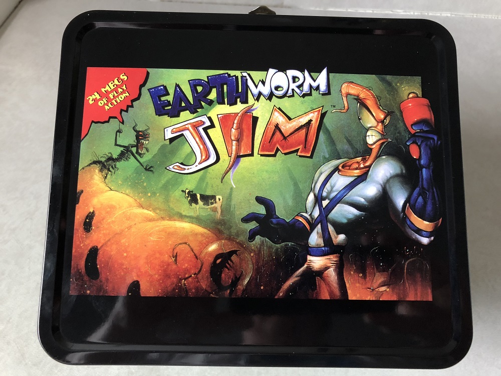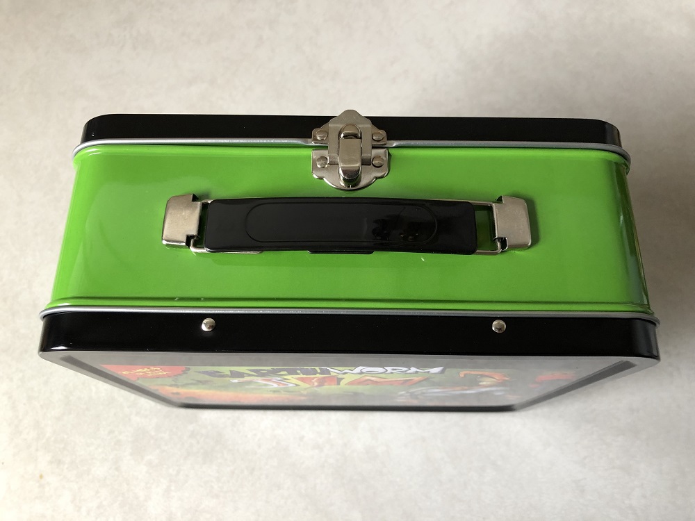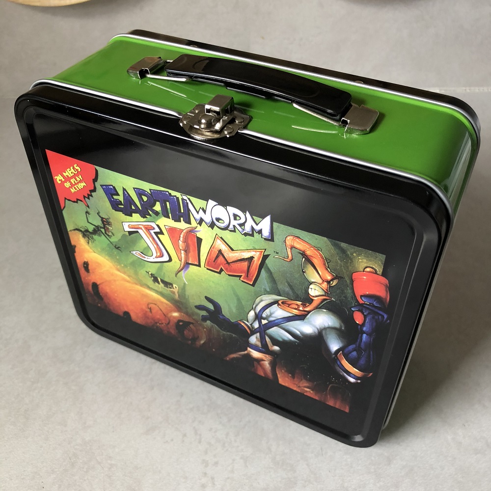 Moving onto the item that made the box as shaped as it was, we got ourselves a metal lunch box with Earthworm Jim on the lid. The cover is actually that of a poster that used to come with the SNES copies of the game, with Jim and the logo poking out of the frame a bit. The rest of the box green and black with silver trim, and nothing additional inside. (Which is kind of sad since it would have been nice to see a thermos included.) Honestly, I'm of two opinions about this. While it is a cool lunch box design and it's nice to have one for the series, the recent activities of Earthworm Jim's creator have kind of soured us on the series as a whole. 12-year-old me would have been all over this, but present-day me doesn't really want it.