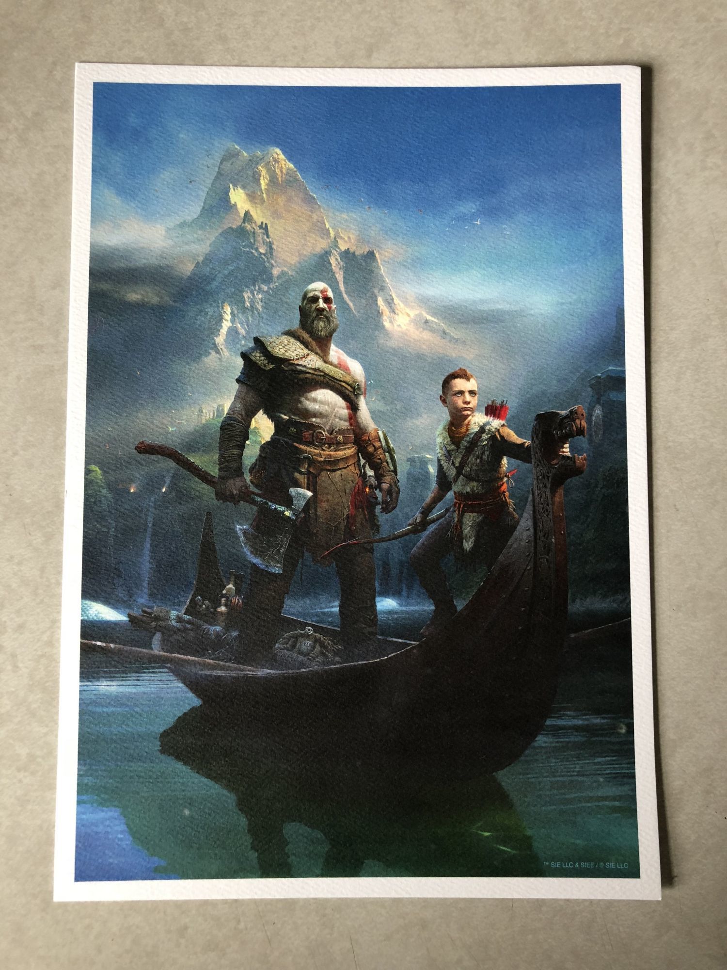 Next, we have an 8×10 inch photo from the game God of War. It's the primary art for the game, but thrown onto paper and designed to make it look like this is a painting. Which is a little insulting because it's not even on a canvas, it's just got a coating on the top to make it look like one. While it looks nice, I'm confused as to why this is here and why it wasn't released months ago when the game actually came out. We're kinda "meh" on this one.
