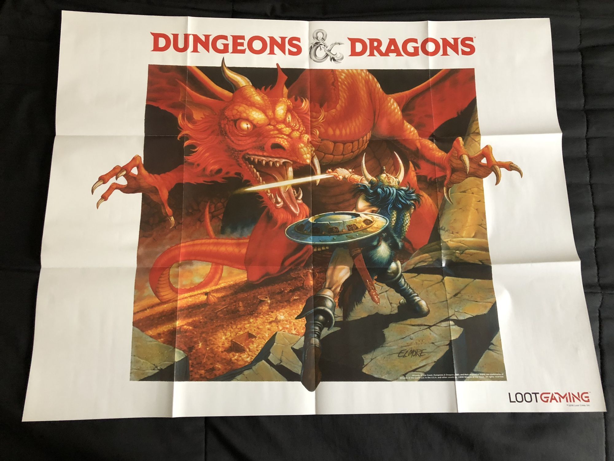 The poster from this box is an old-school art design from Dungeons & Dragons. This one looks pretty awesome, especially considering all the D&D stuff happening right now. It's a nice touch to have parts of the art coming out of the box it was designed in. The only drawback is that it's a folded poster and not rolled up, so now I need to spend months trying to iron the creases out.