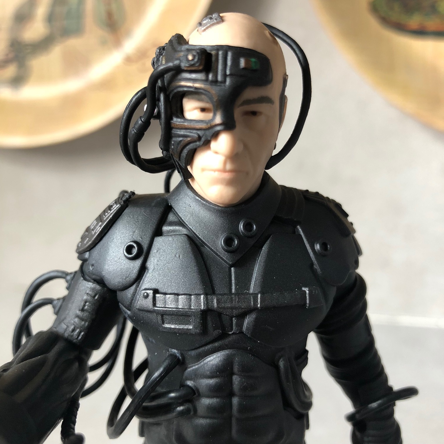 The other figure we got in the box was that of Locutus from the Borg. If you're any fan of Star Trek, you most likely recognize the Borg version of Captain Piccard from "The Best Of Both Worlds", filled with borg parts and sporting a black unitard with a metal plate across his face. This was a really well-done figure, as it captures everything about the costume and design from the episode, all the way down to his mechanical arm that no one ever gave us an explanation as to what it does beyond twist around and make noises. While it's a cool figure with a lot of detail, we're also not quite sure how to feel about it as it shows Patrick Stweart in one of his most unemotional stares and poses possible. It's great to see, but we're not sure who might show this one off.
