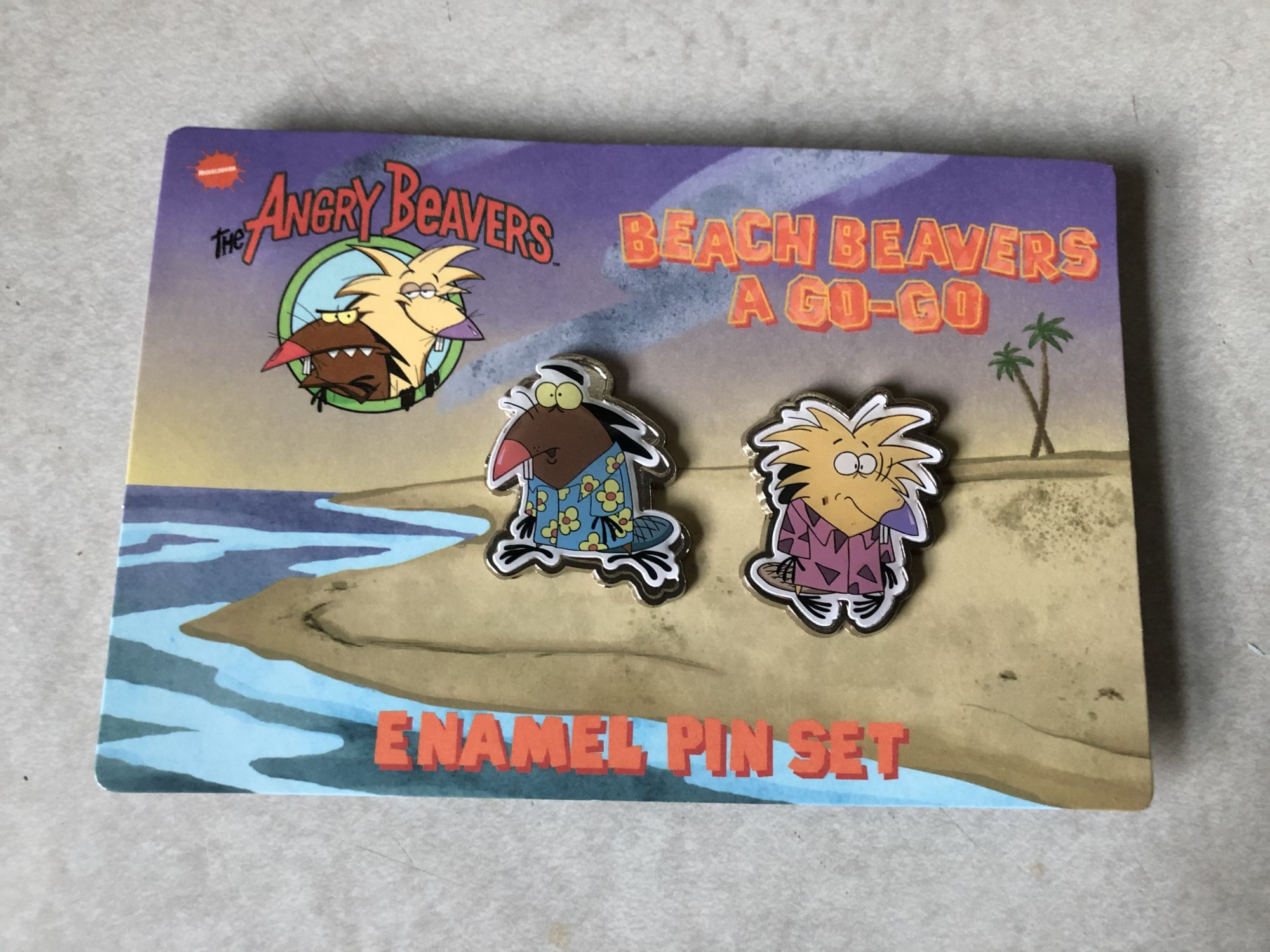 Next up we got some pins from the Angry Beavers. This is both of the beavers in some summer clothing, kind of Hawaiian design, kind of '90s design. The enamel on these is pretty good, and the designs themselves are pretty spot-on to the beavers. Not much else to say about these other than I wish they had rubber stoppers on the back instead of metal ones.