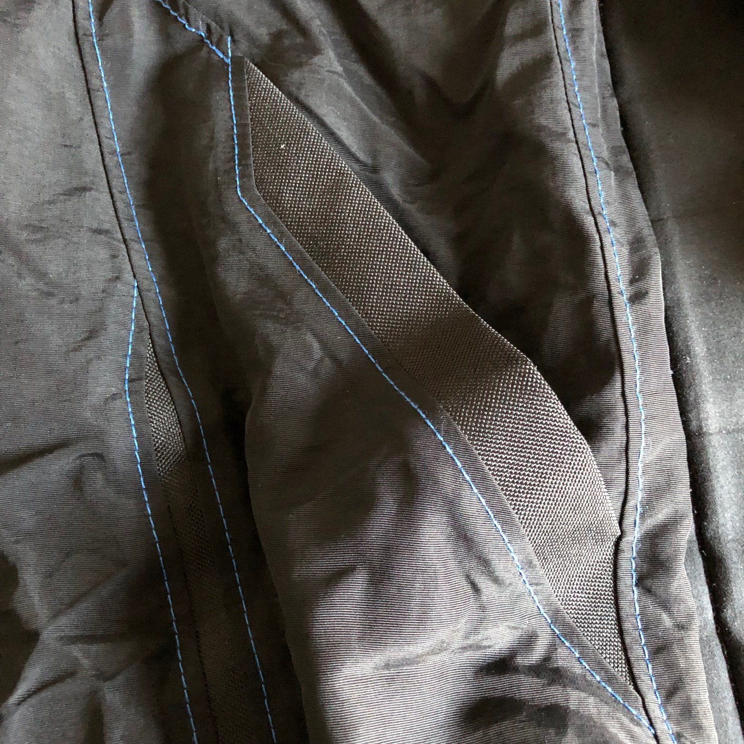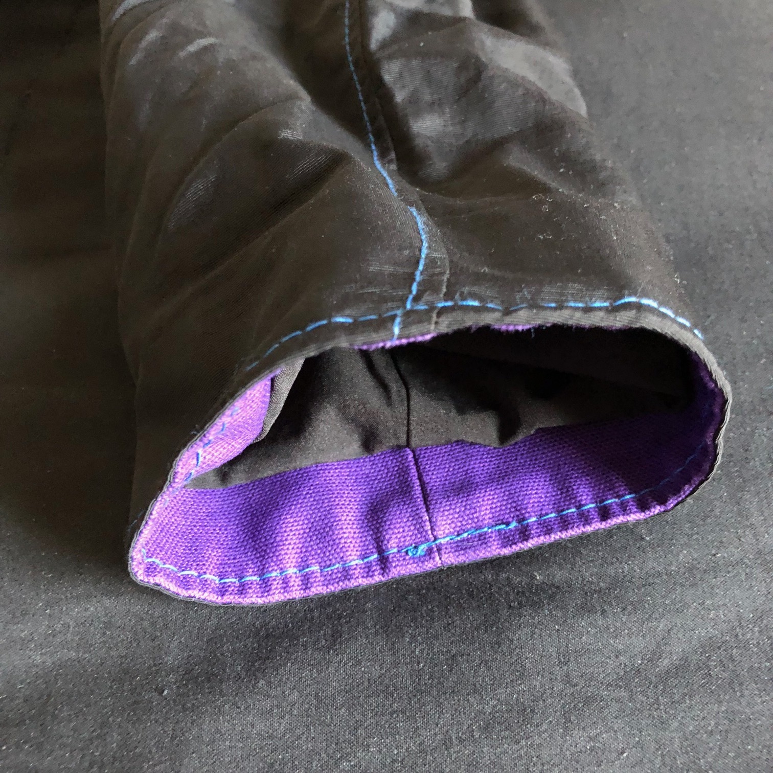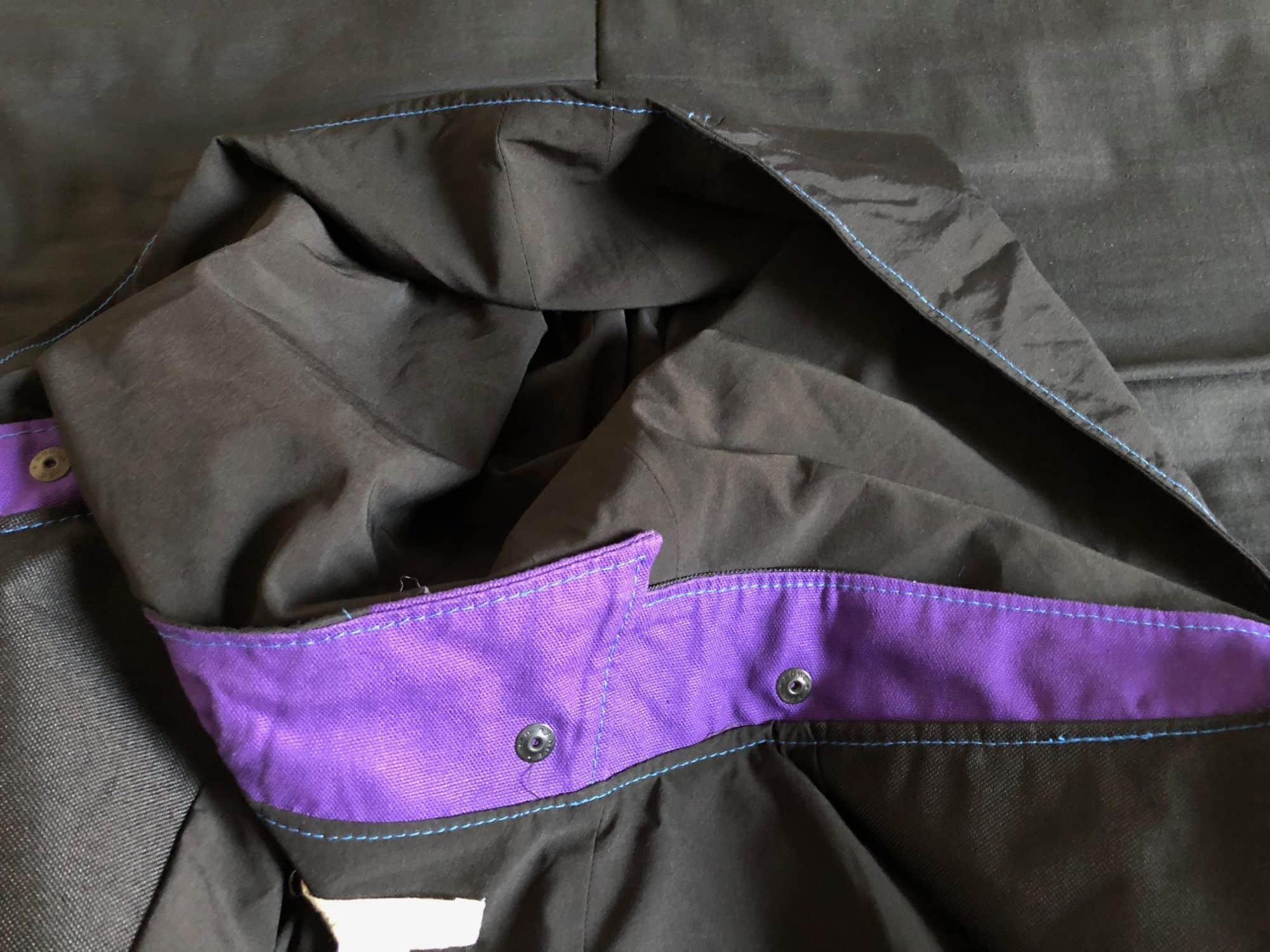 First off, this jacket is one of the lightest pieces of gear we've ever had to review. The material is 90% nylon, 7% vinyl coated poly, and 3% cotton, giving you what is essentially a slick and lightweight feeling that can also absorb some heat and remain waterproof. The stitch work on this to give you a badass black jacket with some colorful accents is brilliant, as you can see here on one of the sleeves where the purple was carefully crafted with blue thread to give a lovely accent while still retaining the black of the coat. I loved this attention to detail throughout the jacket.
