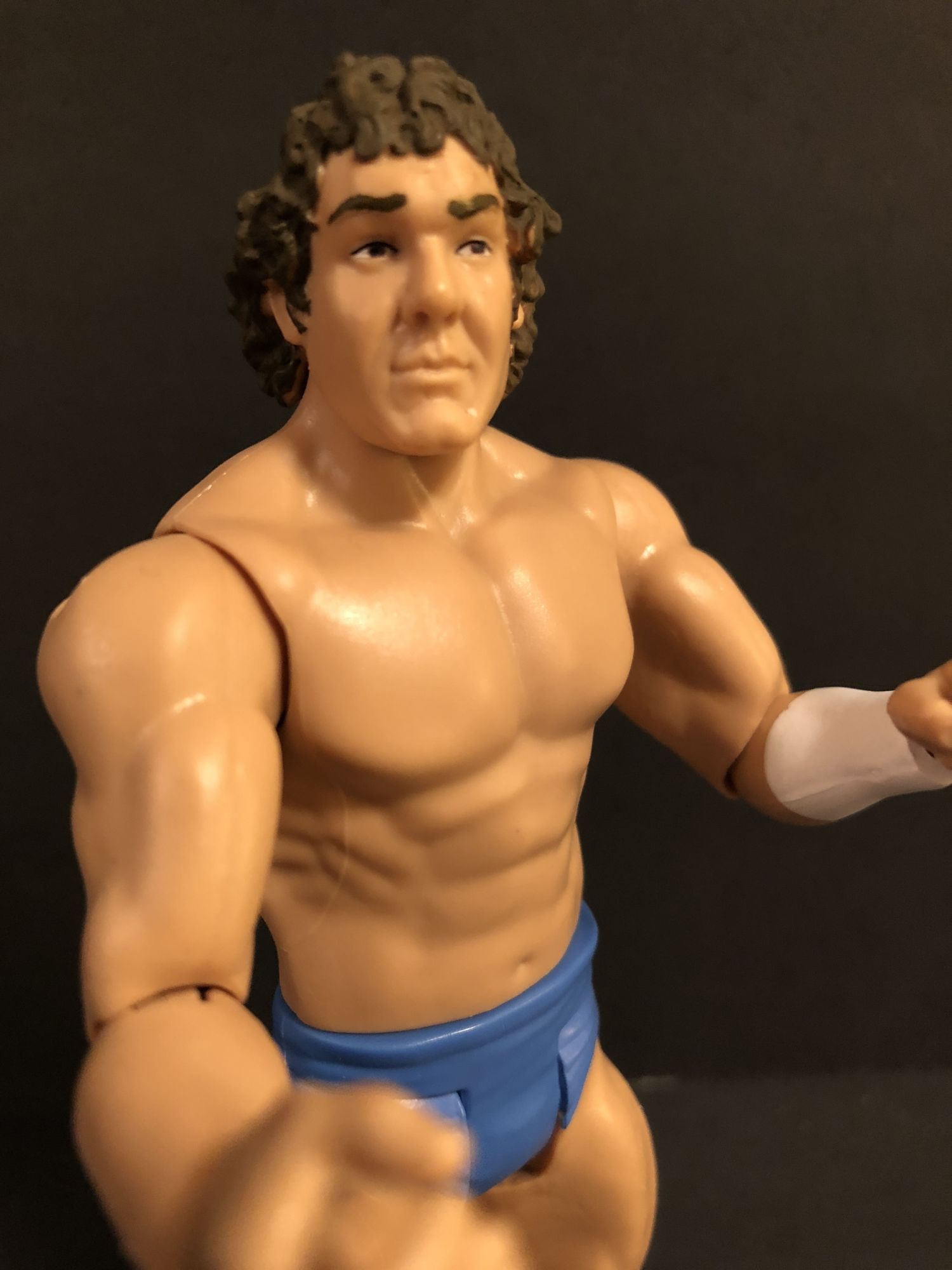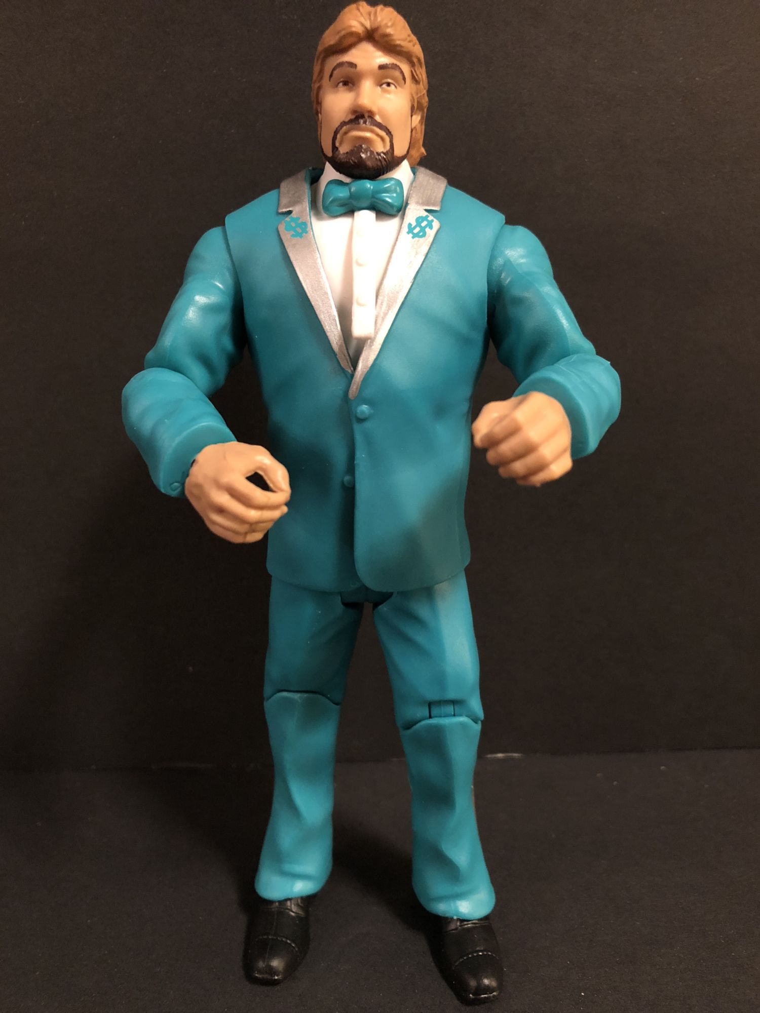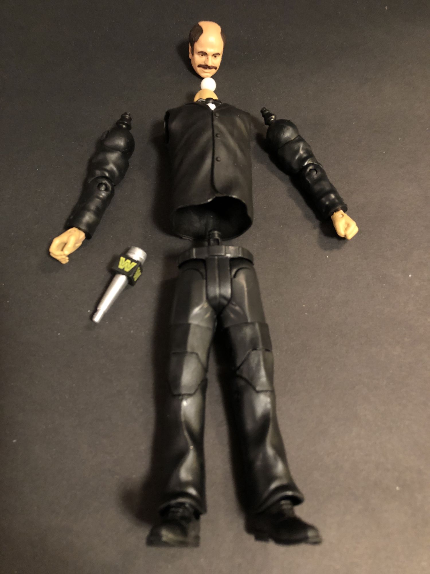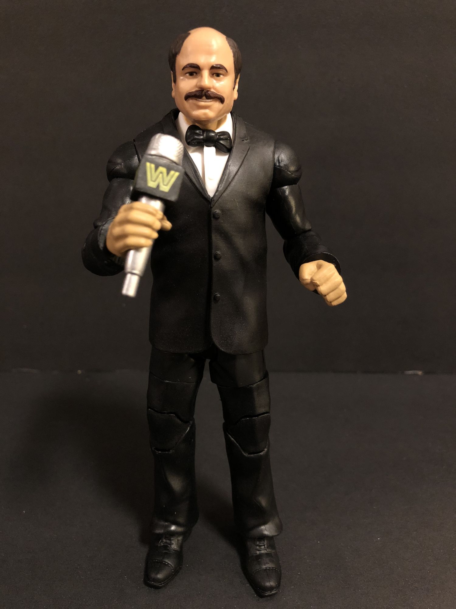 Howard Finkel is an awesome build a figure! I am so happy to have the Fink in my collection, between him and the Elite Mean Gene Okerlund Flashback, the suits are well-represented . He comes with an old school WWE microphone for all your figure fed announcing needs. A little weird that he comes with a closed fist hand, but so be it.